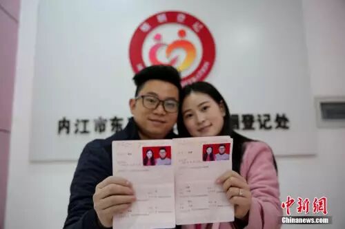 资料图:2016年2月14日,在四川省内江市东兴区婚姻登记处,一对新人在展示刚领取的结婚证书。兰自涛摄