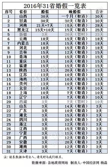 从表格中可以看到,除了山西以外,甘肃地区也保留了30天的婚假,与山西并列第一。