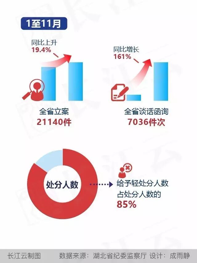 反腐高压态势越来越强。1至11月,立案审查厅局级干部案件112件、处分88人,县处级干部案件910件、处分714人。省纪委两次公开通报典型事件,涉及随州市原常务副市长陈传根案、省农垦局原副局长胡超案等厅级干部案件,引起震动。