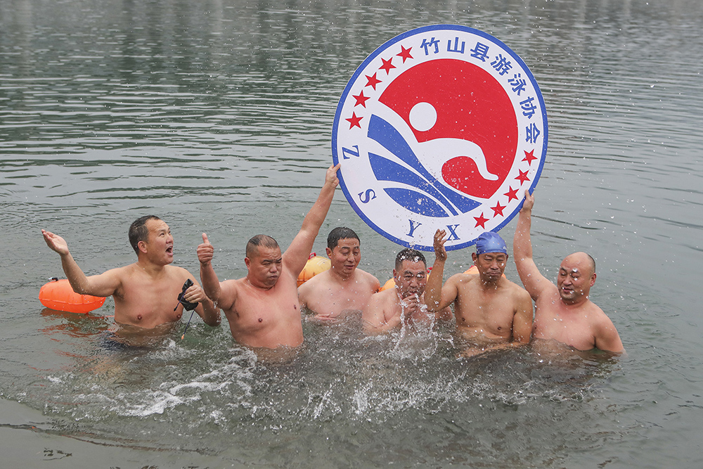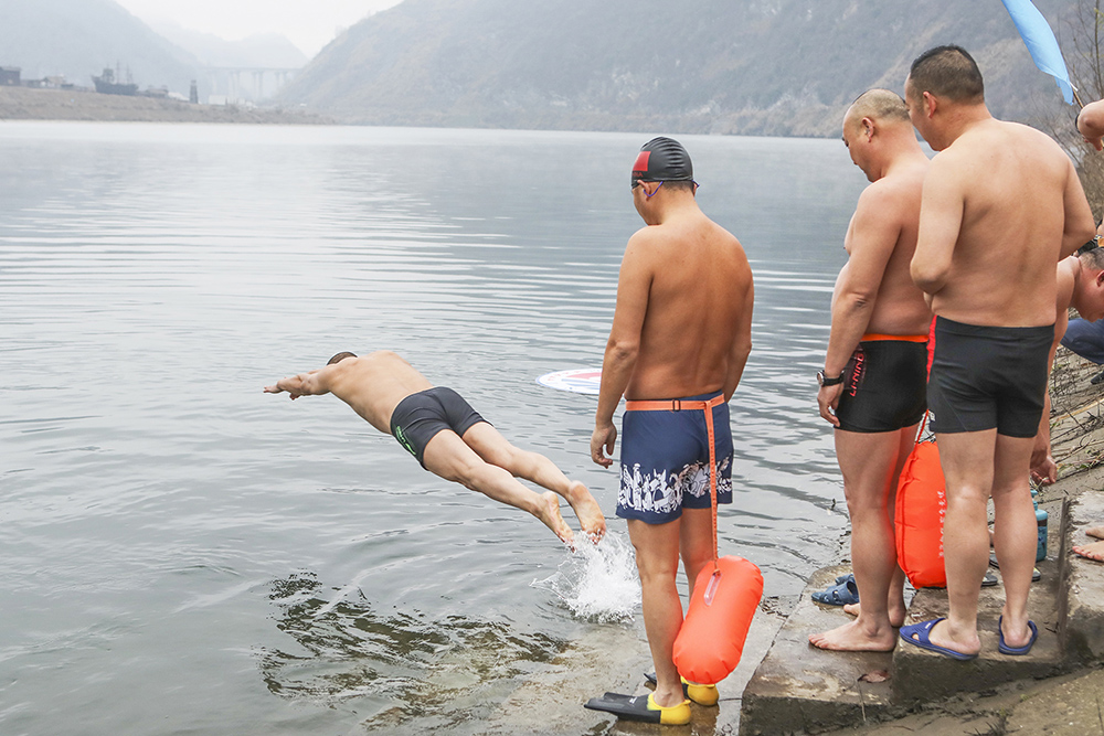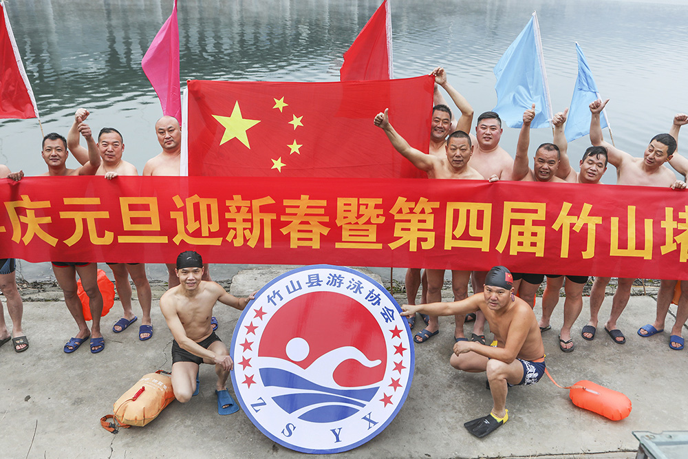 今日竹山网消息 2022年1月1日上午,寒风凛冽。前来潘口参加堵河冬泳的游泳爱好者,匆匆换上泳装,渐次奔入冰冷的河流,他们以冬泳运动,庆祝新一年的到来。