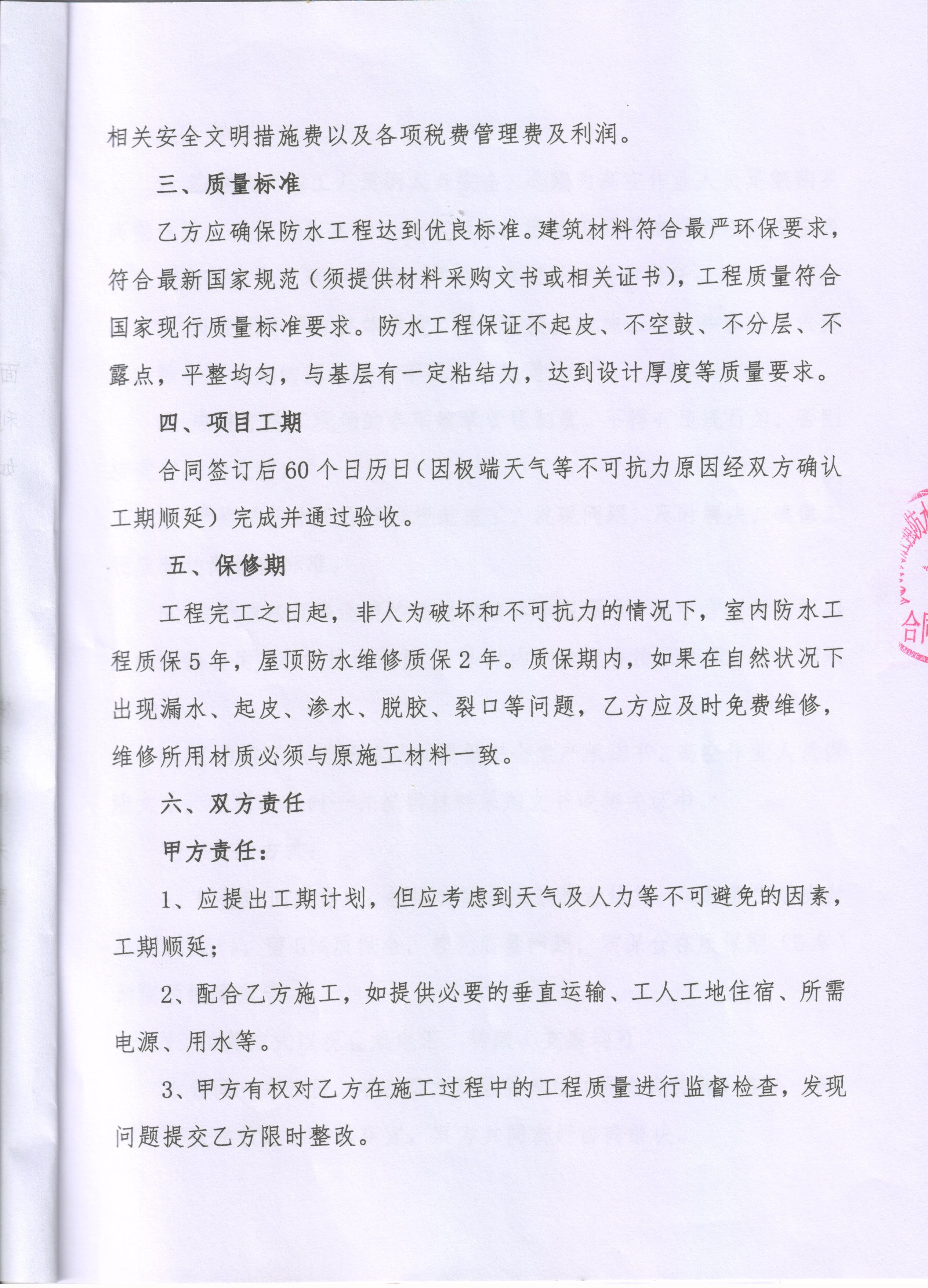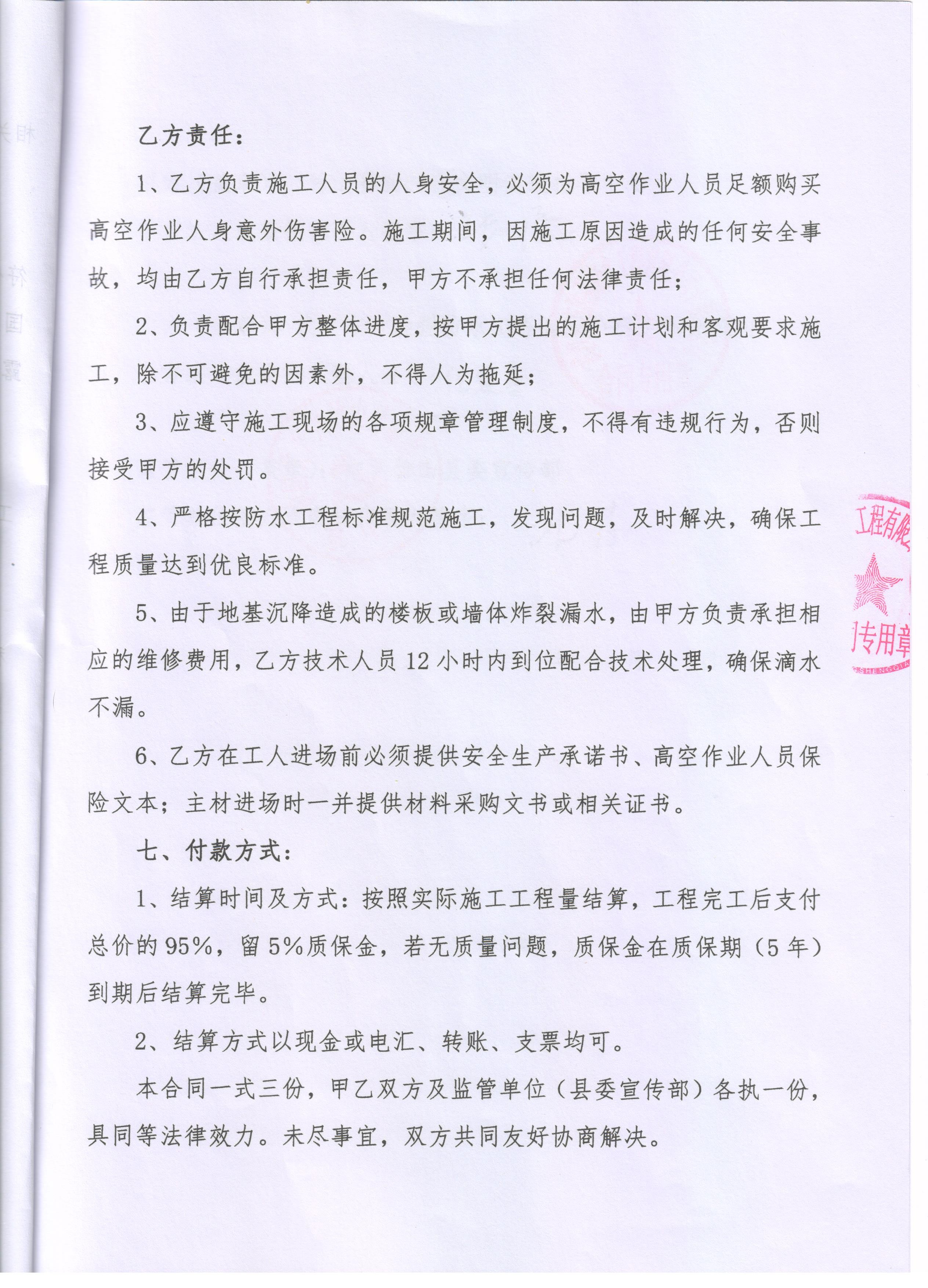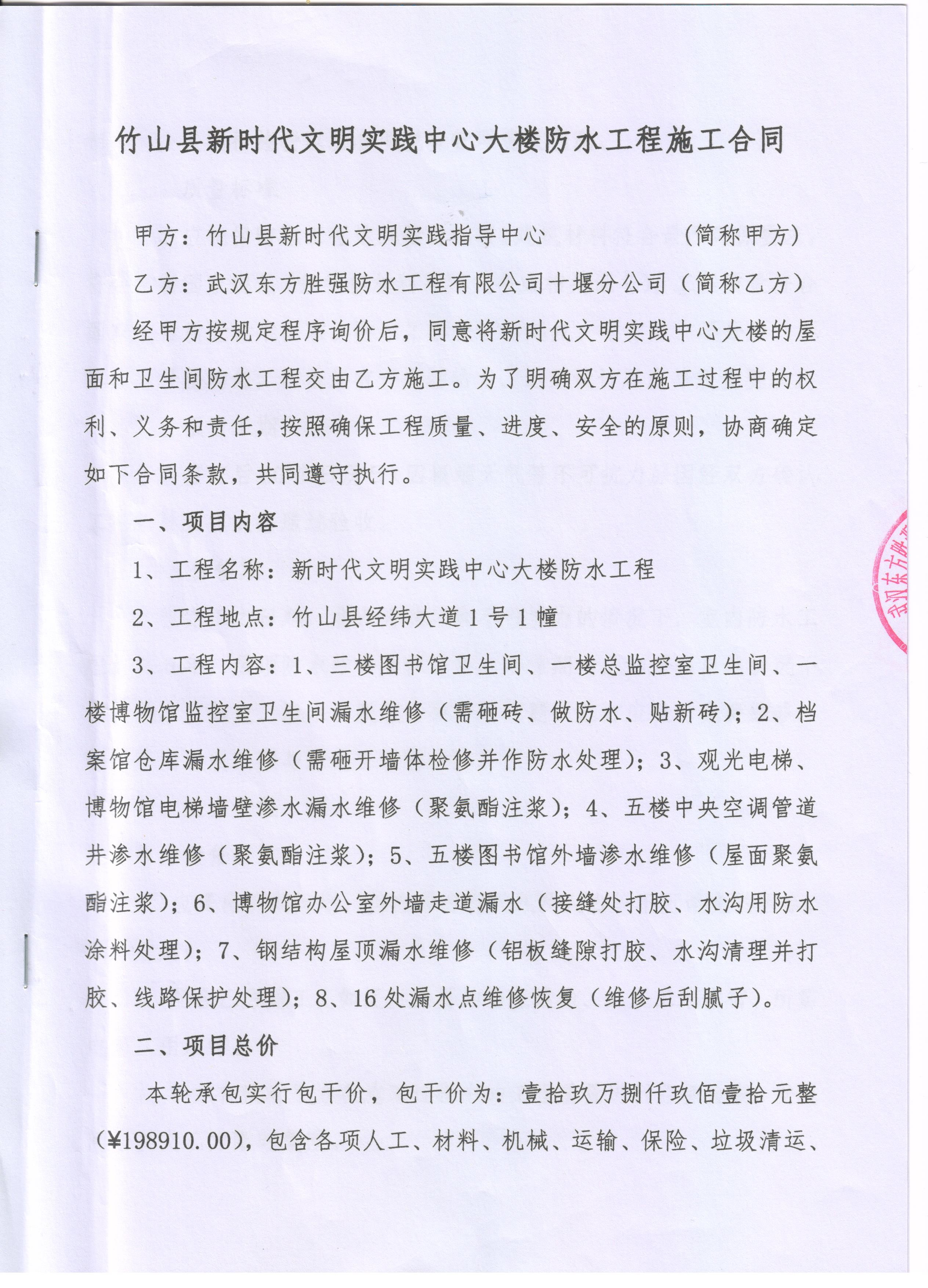 我部发布拟对新时代文明实践中心大楼防水工程项目进行询价采购的询价公告后,按规定流程并经询价小组综合比选,确定由武汉东方胜强防水工程有限公司十堰分公司为本项目的承包商,成交金额为198910.00元,合同内容如下。