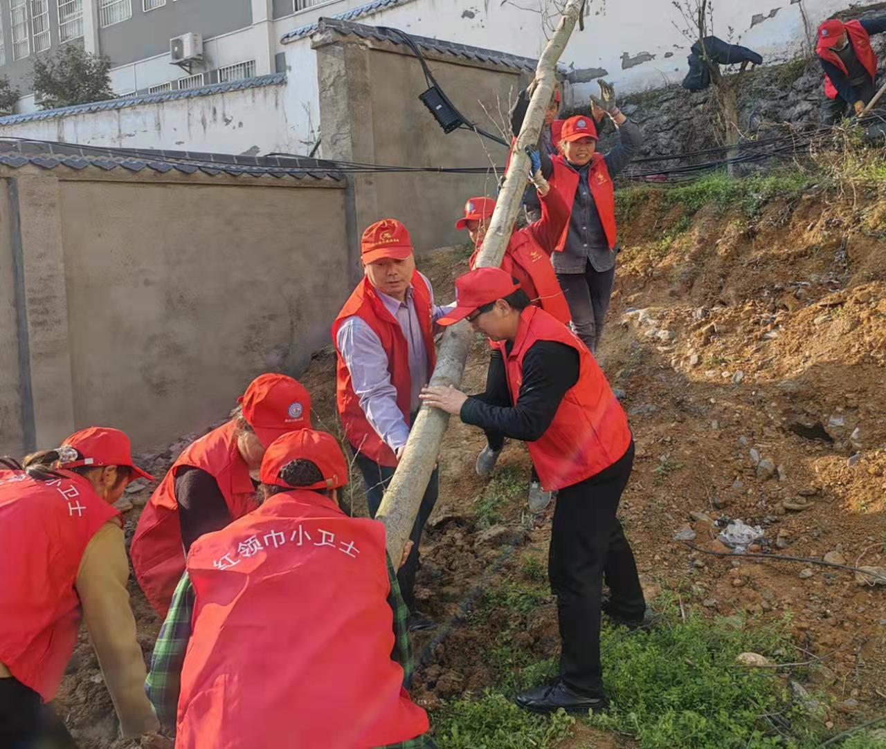 在该镇富康路居委会安坡公墓基地,志愿者们细化分工,按照植树技巧,经过打窝、碎土、扶苗、盖土、浇水等工序,20余棵油茶幼苗拔地而起。