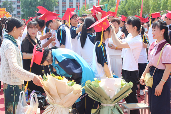 800多名学生在家长、老师的陪伴下,迈上红毯,走过写有“成人门、成长门、成才门”的三个红色拱门,双手接过18岁生日礼物——《中华人民共和国宪法》,共唱生日之歌,依次与老师击掌相庆。在场的家长为孩子们戴上了成人帽、成人徽章,送上成人纪念品。学生向父母呈读感恩信,向最亲最爱的家长三鞠躬,表达18年养育之恩的深深谢意。一封封家书,纸短情长,孩子们发自肺腑的真情告白让许多家长流下了激动的泪水。