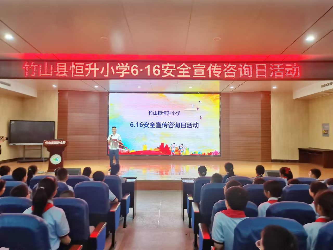 今日竹山网消息 6月16日,恒升小学在学术报告厅开展“6·16安全宣传咨询日”活动。