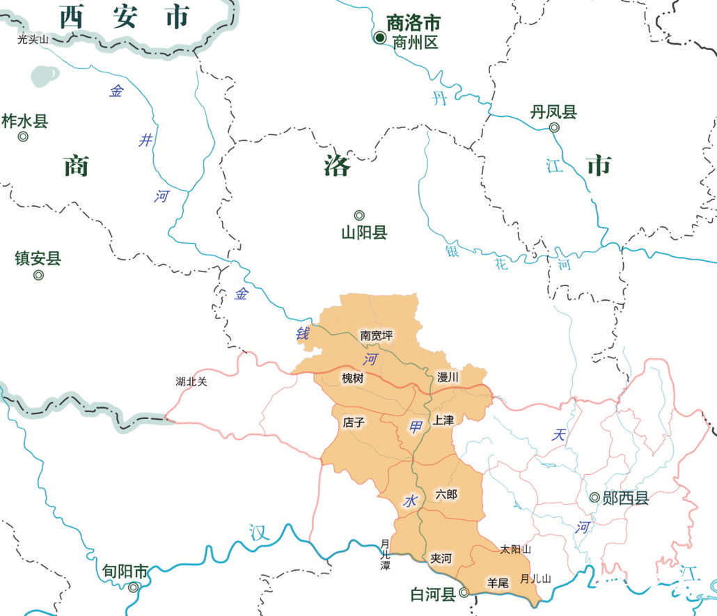 甲国的范围即古甲水流域。要熟知这段历史,先了解古甲水。古甲水和甲水是两个概念,主要是河段不同。今天的金钱河起源于秦岭山脊长安区与柞水县光头山,过陕西柞水、镇安、山阳三县,至郧西夹河关入汉江。