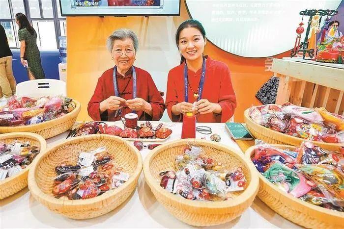 △王秀英和孙女孙歌尧展示“针棒香包”制作技艺。