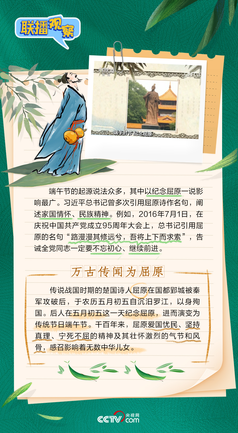 习近平总书记曾在多个场合对端午节的传统习俗、文化标识倾注关怀。央视网《联播+》特推出海报,与您品习俗、度佳节。