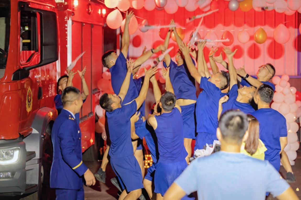 工作中,他们是逆火而行,不惧艰险的蓝朋友,生活中,他们也可以柔情似水,浪漫温暖的消防员,和平年代的危险职业,他们值得获得我们的掌声和赞扬,他们的家人,同样值得获得问候与祝福!如果你问我,爱情是什么颜色的?我会说:别人可能是纯洁无瑕的白色、热情似火的红色、浪漫温柔的紫色,但是消防员的爱情一定是蓝色的,火焰蓝的蓝!最后祝他们永远幸福!(袁丝竹 王慧)