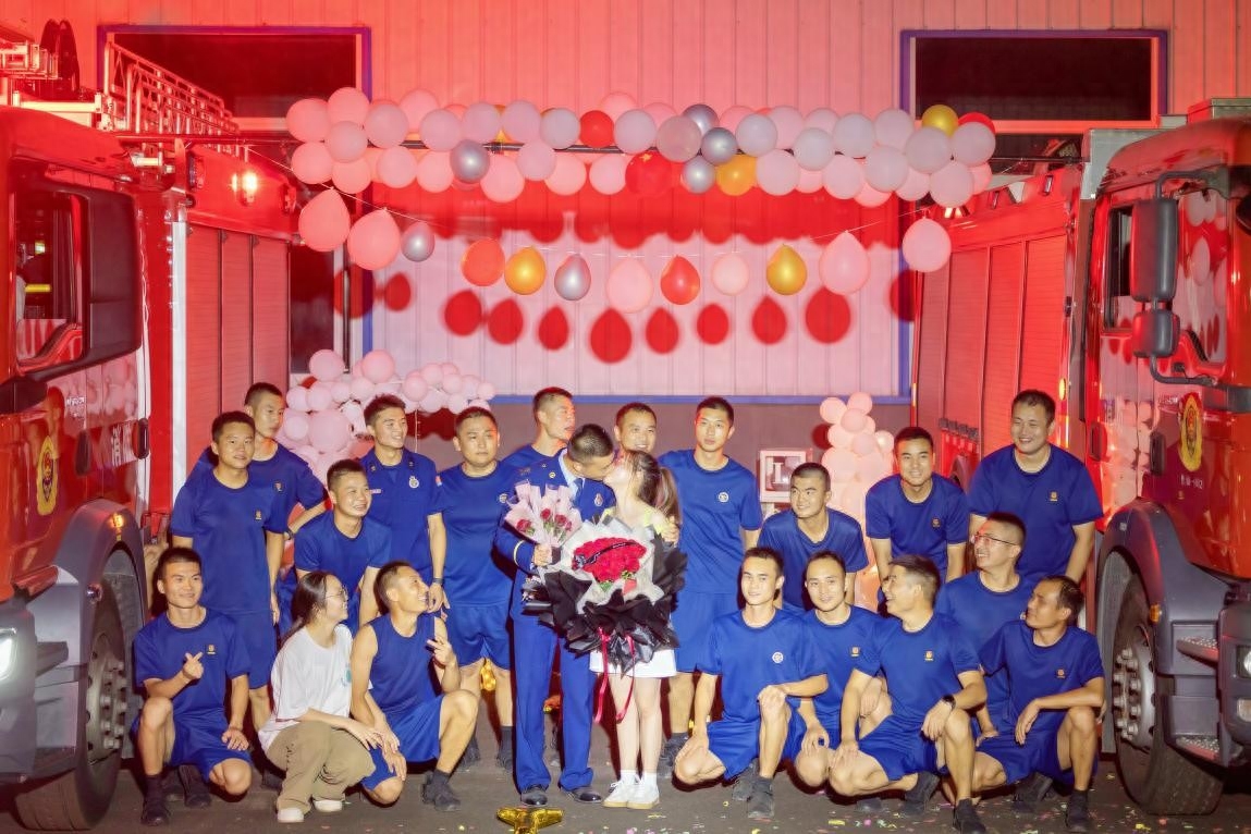 9月16日晚,一场浪漫的求婚仪式在竹山县消防救援大队营区上演。27岁的消防员邓亚雷手捧鲜花,身着常服在爱心蜡烛旁向女友汪霞求婚,完美展现了消防“蓝朋友”铁血柔情的另一面。