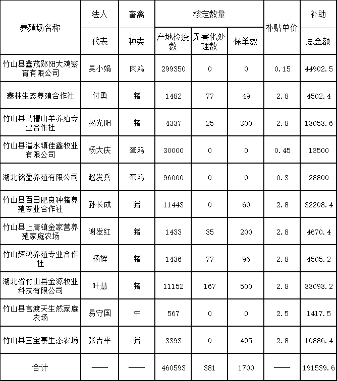 为进一步促进养殖场依法落实动物防疫主体责任,全面提高重大动物疫病防控能力。根据《农业农村部办公厅关于深入推进动物疫病强制免疫补助政策实施机制改革的通知》(农办牧〔2020〕53号)、《省农业发展中心、省财政厅、农业农村厅关于印发2020年湖北省规模养殖场动物疫病强制免疫“先打后补”实施方案的通知》(鄂农发〔2020〕11号)、《竹山县重大动物疫病防控指挥部关于印发竹山县重大动物疫病强制免疫“先打后补”工作实施细则(试行)的通知》(竹动防〔2021〕1号)文件精神,采取养殖业主自愿申报,县畜牧兽医部门审核,现将符合2023年重大动物疫病强制免疫“先打后补”政策补贴对象及补助金额面向社会予以公示,公示时间5个工作日(2024年1月22日至1月26日)。公示期间,广大干部群众可通过信函、电话等方式向县畜牧兽医服务中心反映有关情况,反映情况要实事求是、客观真实,以便调查核实,联系电话:0719-4226661。