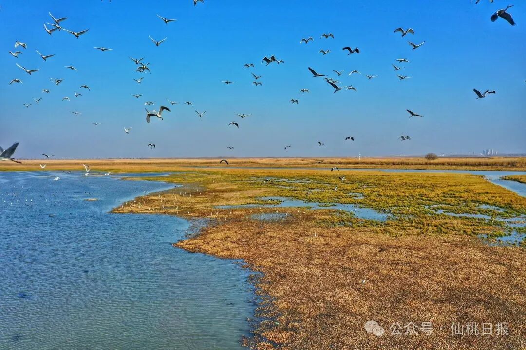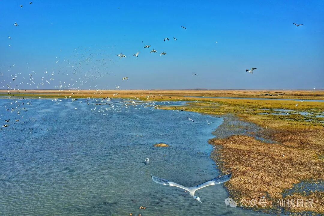 “嘎——”湿地深处,又惊起一群候鸟,在碧空结队盘旋、俯冲掠食,随后四散开来,消失在芦苇荡里。“小天鹅、白头鹞这些‘老朋友’又来了,‘稀客’也不少。等明年开春,它们还会再来……”