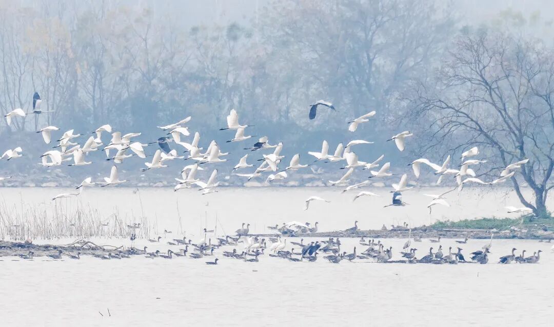 国家二级野生保护动物白琵鹭翔集梁子湖