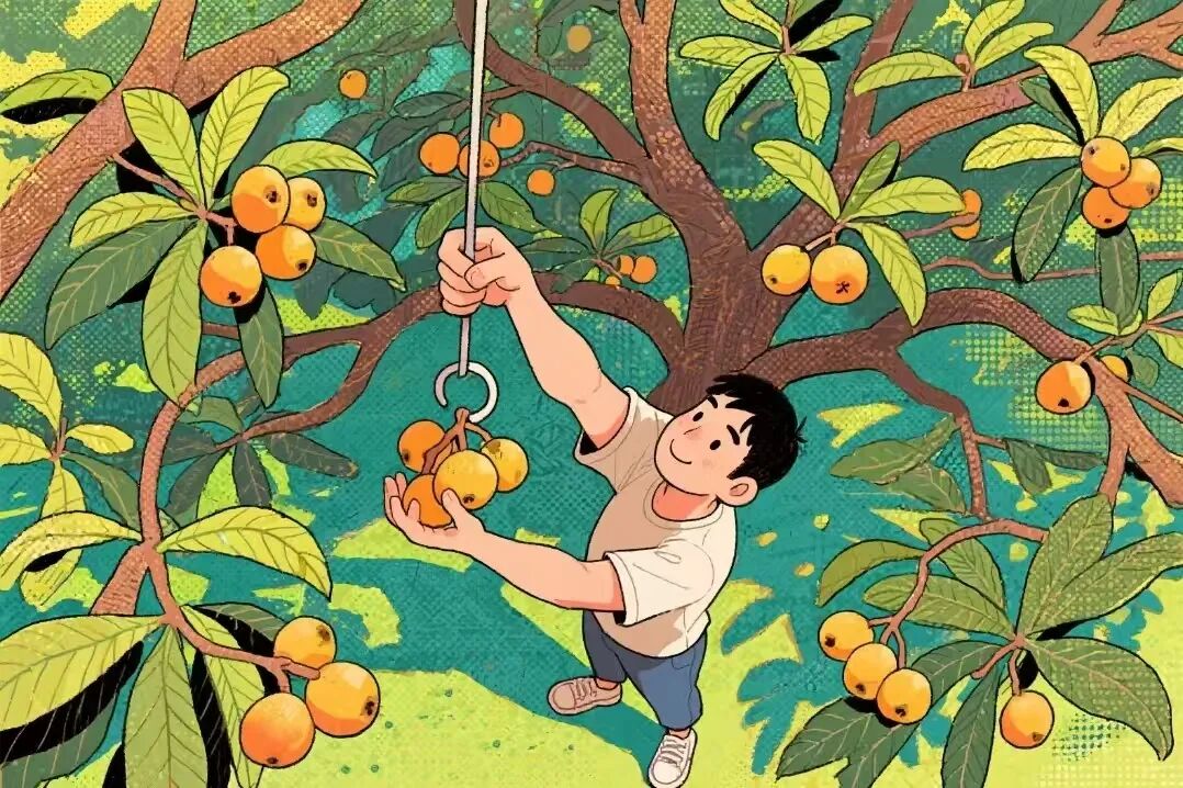 如今再看枇杷树,难免还有一点手痒,但稍微掂量掂量现在的年纪,再掂量掂量现在的“矫健身姿”,已是自觉拿起曾经十分瞧不起的钩子。确定目标、迅速瞄准、一击则中,若是不中再来一击……原来用钩子钩枇杷,也有这样的乐趣么?但长期伏案工作让我的颈椎不太适应这样的乐趣,何况乡亲们还指着枇杷赚钱补贴家用,便只钩下来两个,金灿灿地落在掌心,被阳光一照,愈发神气起来,几乎要摇头晃脑了,真是可爱得紧。我心下突然急切起来,潦草地掀起衣襟下摆,心理安慰般擦了擦枇杷,就地蹲下开始剥皮。