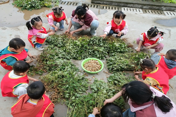 随后,期待已久的采摘环节正式开始。老师向幼儿介绍了有关花生的知识,指导他们动手采花生,鼓励他们通过亲自实践了解花生的生长过程。孩子们既兴奋又小心翼翼,看到自己拔的一颗颗花生宝宝露出了小脑袋,大家难掩脸上的兴奋和喜悦之情。花生拔完了,紧接着便蹲在地上摘花生,大家你一言我一语,“我摘的花生比你的多”“我这里的花生比你的大!”劳动现场热火朝天,大家忙得不亦乐乎。收获花生,分享快乐。幼儿通过参加拔花生、摘花生、洗花生、品花生等活动,感受收获劳动成果的喜悦,培养热爱劳动以及珍惜粮食的情感,调动学习与探究的兴趣。