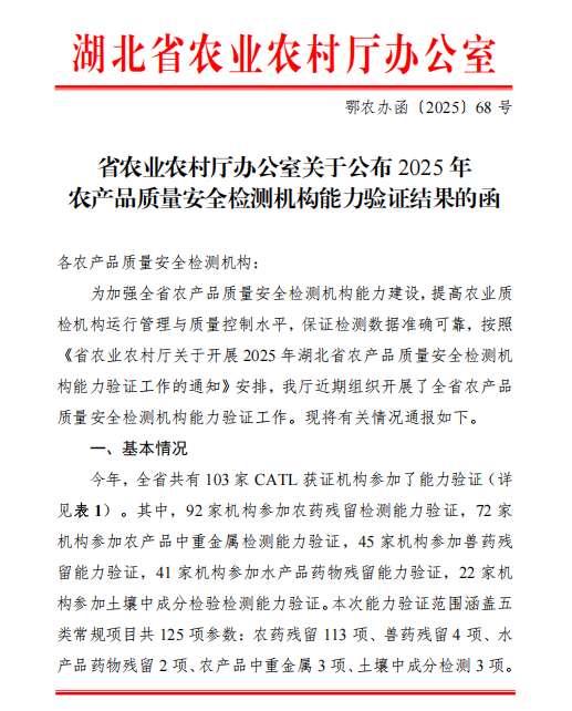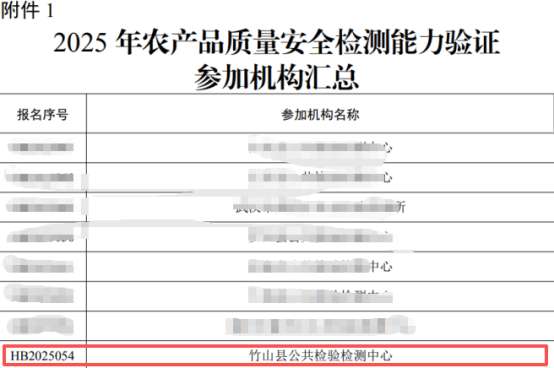 今日竹山网信息 近日,湖北省农业农村厅公布2025年度检验检测机构农产品质量安全能力验证结果,县公共检验检测中心顺利通过“农产品中农药残留检测”“农产品中重金属检测”“畜禽产品中兽药残留检测”三项能力验证,该中心所涉及的多项参数考核结果均为“合格”。