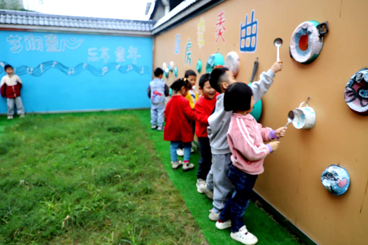 该园的老师们匠心独运,将废旧物品变废为宝,在园内闲置边角的空地处布置了一个音乐小天地。利用废旧的锅、碗、瓢、盆、不锈钢蒸格、矿泉水瓶、木板、铁盘等自制简易打击乐器,在孩子们的手中变成了美妙的乐器。孩子们在这里化身为创意十足的“小演奏家”自由探索,边玩边学,乐在其中,让孩子们敲出属于自己的乐章。(刘东 刘婷)