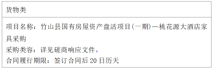 二、项目名称:竹山县国有房屋资产盘活项目(一期)—桃花源大酒店家具采购