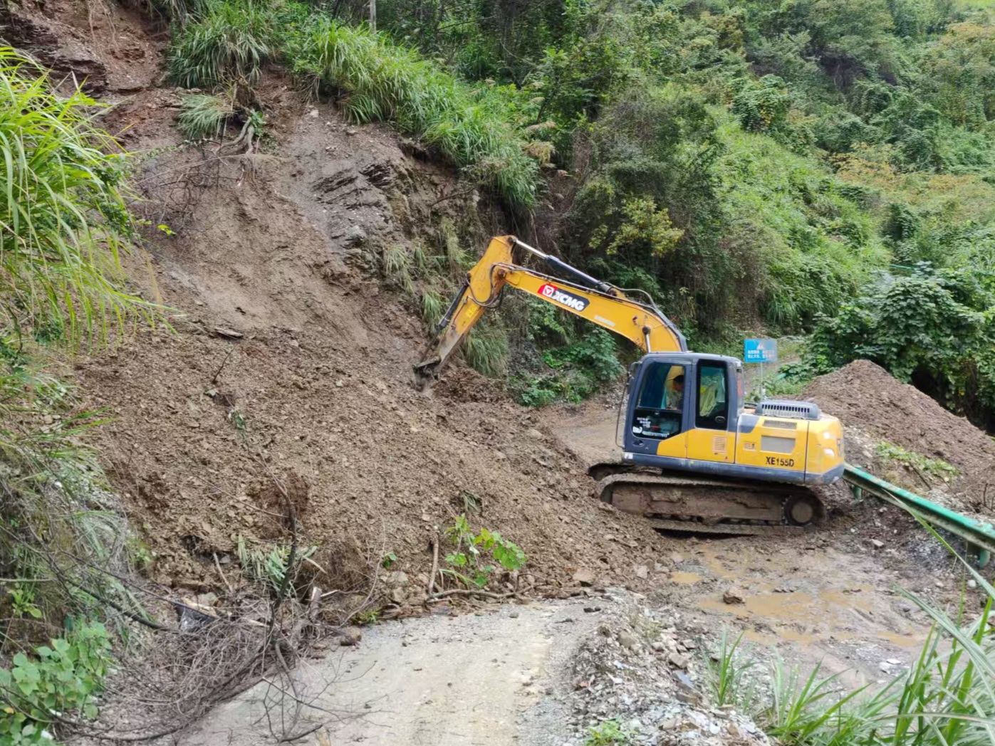 在通村主干道塌方现场,挖掘机挥舞铲斗清理堆积的土石,工作人员手持铁锹、扫帚配合清运碎石和淤泥,沿路村民也主动参与,大家分工协作推进清障工作,形成了“干部带头、群众响应”的良好局面。