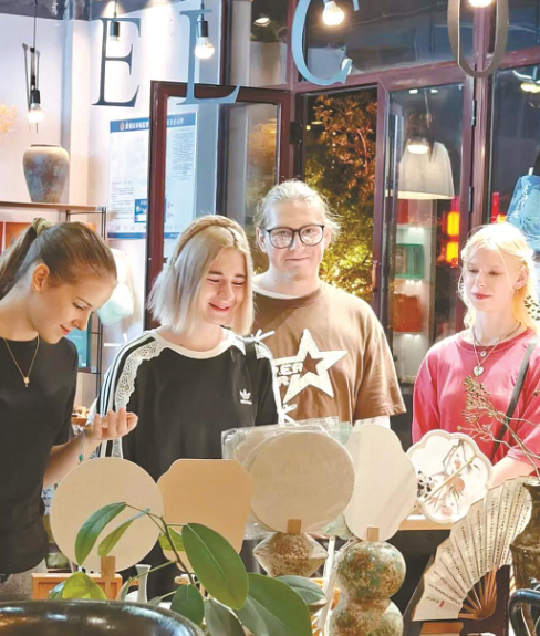 图为国庆期间在尚品燕鲜炖店选文创产品的外国游客。 通讯员 刘美荣 摄