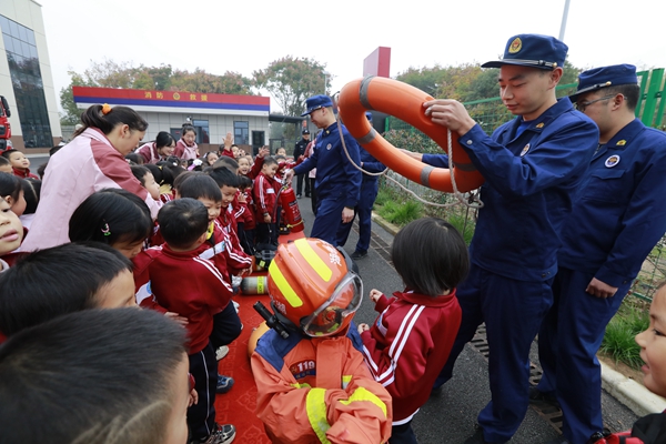 活动中,消防员为孩子们带来了一堂生动的消防安全课。通过互动问答,讲解了火灾报警、火场逃生等基本常识。在装备展示环节,无齿锯、液压扩张器等专业救援器材引起了孩子们的浓厚兴趣,消防员结合生活场景细致讲解其功能与安全注意事项。在消防员的专业指导下,孩子们尝试穿戴消防服、操作灭火器,并登上了威武的消防车亲身体验。通过这些实践,孩子们对消防工作有了更直观的认识,也在心中播下了关注消防安全的种子。