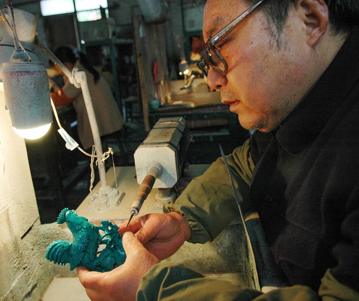 电商打开了市场,而“文化赋能 + 工艺革新”才是让石头真正变成“宝贝”的核心秘诀。在竹山绿松石雕刻大师曹红星这里,他用技艺诠释着“化腐朽为神奇”。他曾将一块原本价值不高的石料,经设计雕刻后打造出“松下对弈”作品,使石料价值实现上千倍增长。正是这样的匠心雕琢,让绿松石产业摆脱了对原料的依赖,成功跻身高端文创与珠宝行列,实现了质的飞跃。