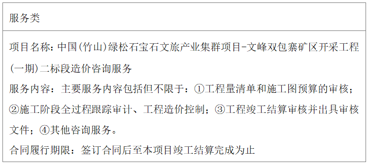 二、项目名称:中国(竹山)绿松石宝石文旅产业集群项目—文峰双包寨矿区开采工程(一期)二标段造价咨询服务