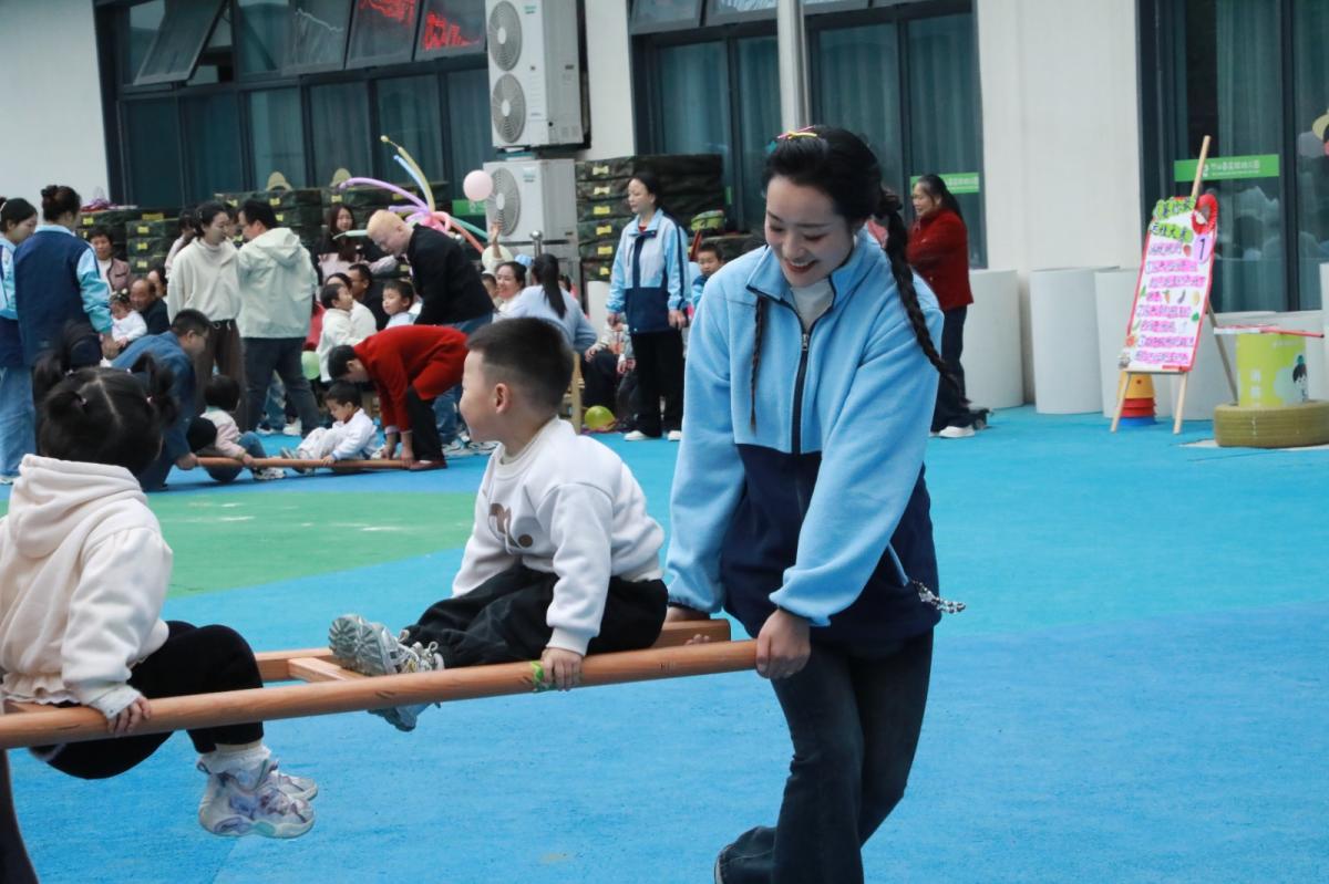 在“抬小猪”接力赛活动中,家长们小心翼翼地抬着孩子奔跑,考验着平衡与速度;“猪八戒背媳妇”挑战赛上,大家背着各自的宝贝,双腿夹住呼啦圈,在赛道上奔跑,欢呼声此起彼伏;“吹面粉”游戏里,家长们合作拉动“面粉”道具,体验团队协作的力量;“赛龙舟”“踩气球”等充满童趣的项目,让赛场变成了欢乐的海洋。