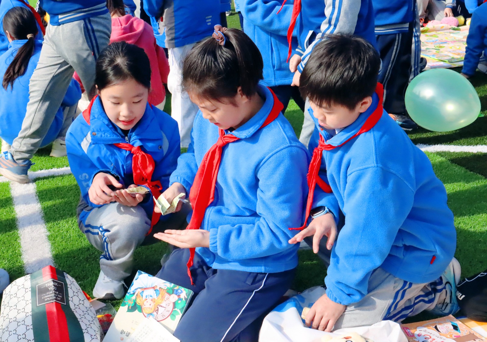 活动现场童趣满满,宣传板与横幅相映,摊位图书琳琅满目。五年级学生在老师引导下化身“小掌柜”,精心布置摊位。“小市场”里,“买卖”气氛热烈。“小掌柜”热情推销,有的吆喝,有的“买书送礼品”,还有的流动推销;“小顾客”穿梭其间,认真挑选,询价、砍价、交易。童言童语让现场活力四射。欢笑声、叫卖声、讨价还价声等吸引了众多老师“淘宝”,不少老师满载而归。挑选到心仪书籍的孩子席地而坐,专注阅读,构成动人画面。