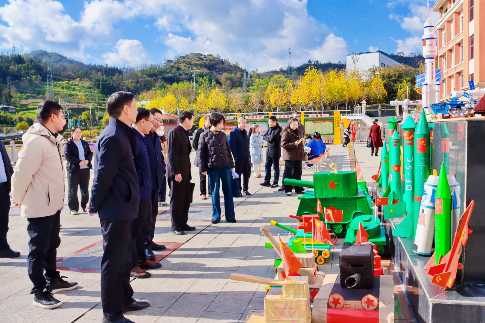 日升广场上,书法作品苍劲有力,国防科技作品创意十足,传统文化与现代国防相融合。非遗传承项目《堵河奇石》展台令人惊艳,学生以堵河奇石为画布,绘就各类图案,获评委称赞。