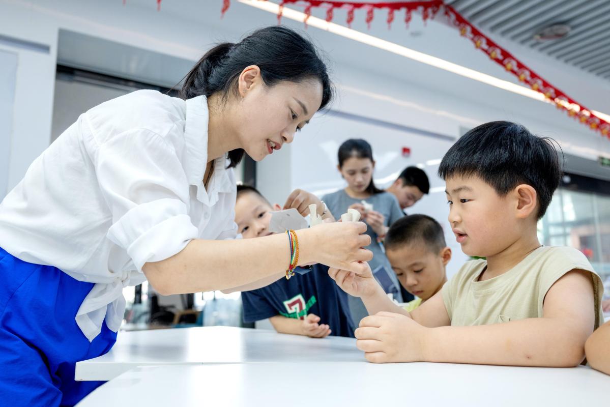△2025年7月3日,浙江湖州长兴县龙山街道齐北社区幸福邻里中心,志愿者指导孩子们制作手工。