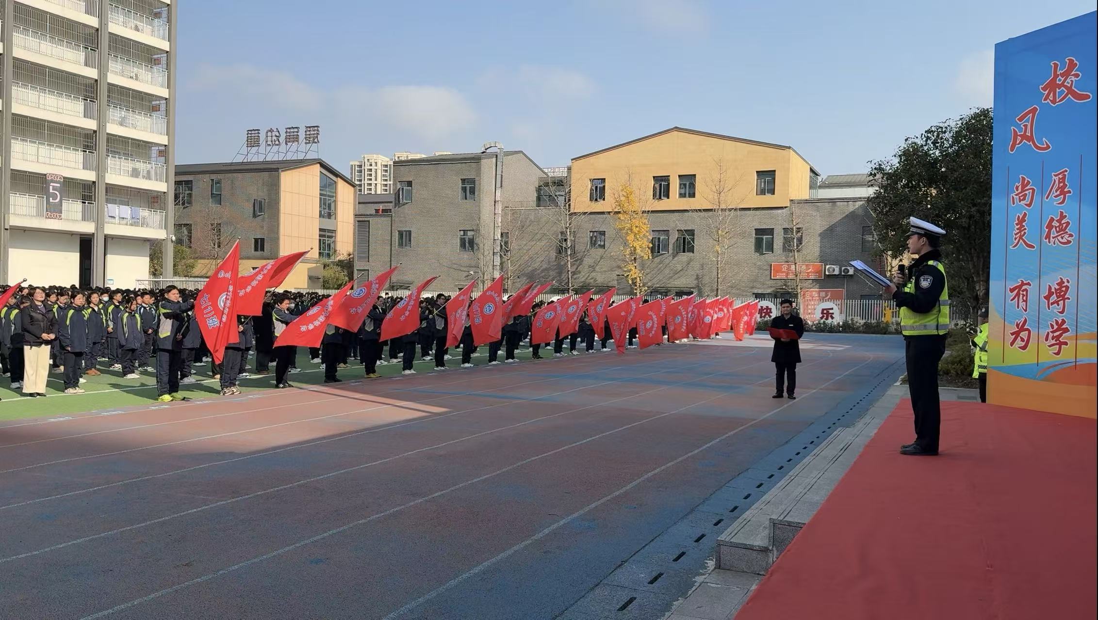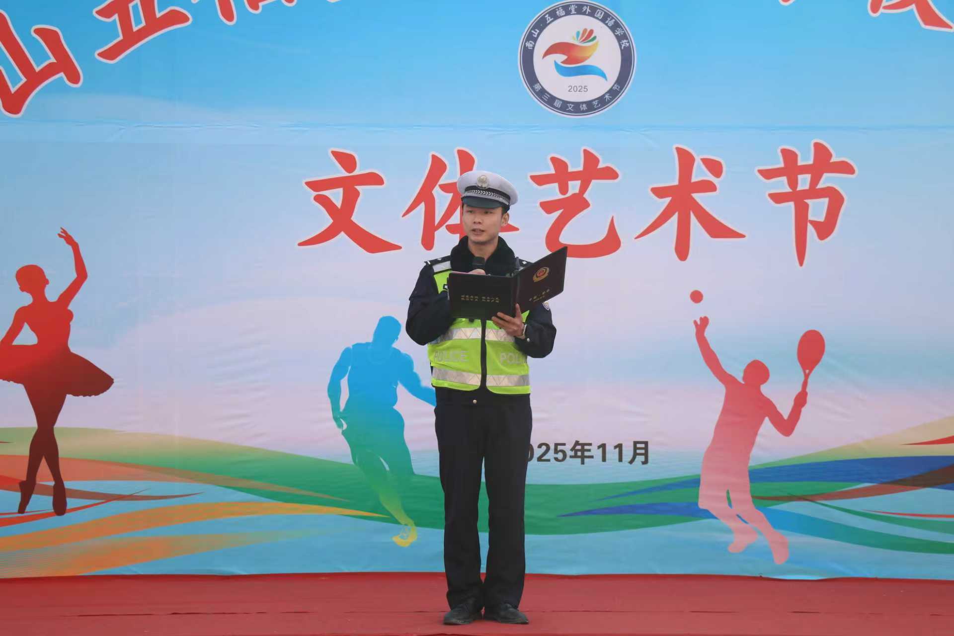 今日竹山网消息 12月1日,南山五福堂外国语学校全体师生齐聚操场参加升旗仪式。本次国旗下讲话环节特别邀请到县公安局交通警察大队一中队民警,为师生们带来一场生动实用的交通安全知识宣讲,将交通安全教育融入校园日常,为孩子们的成长之路筑牢安全防线。