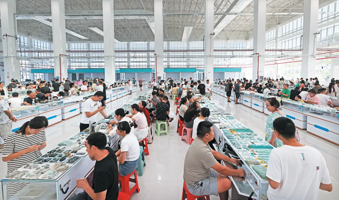 走进国际绿松石交易中心,数百个店铺摊位组成的交易现场热闹非凡,直播、询价、洽谈声此起彼伏。一块块泛着油绿光泽的绿松石在商家与游客手中流转,一笔笔交易在默契洽谈中达成,让这份深山瑰宝走向全球。