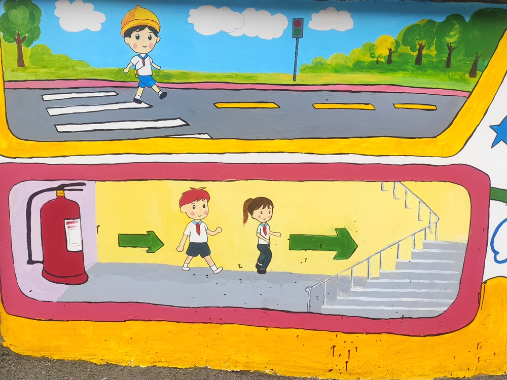 漫步校园,过马路走斑马线的卡通小人、“不私自下水游泳”的温馨警示、火灾逃生的正确步骤图解……每一幅彩绘都构思巧妙、寓意深刻,让原本单调的墙面变得“会说话、能育人”。孩子们在课间嬉戏时,总会驻足观看、相互讨论,在潜移默化中记住安全知识、增强自我保护意识。