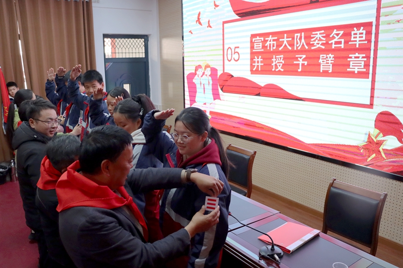 随着激昂的《出旗曲》响起,三名旗手迈着铿锵有力的步伐,队员们齐声高唱《中国少年先锋队队歌》,歌声中充满了对少先队组织的无限热爱与憧憬。在经过民主投票后,新一届少工委成员脱颖而出,少工委主任武世华亲手为大队委委员们佩戴上标志,象征着责任与使命的传承,旨在让少先队员们在实践中诠释责任,在比拼中追逐梦想。