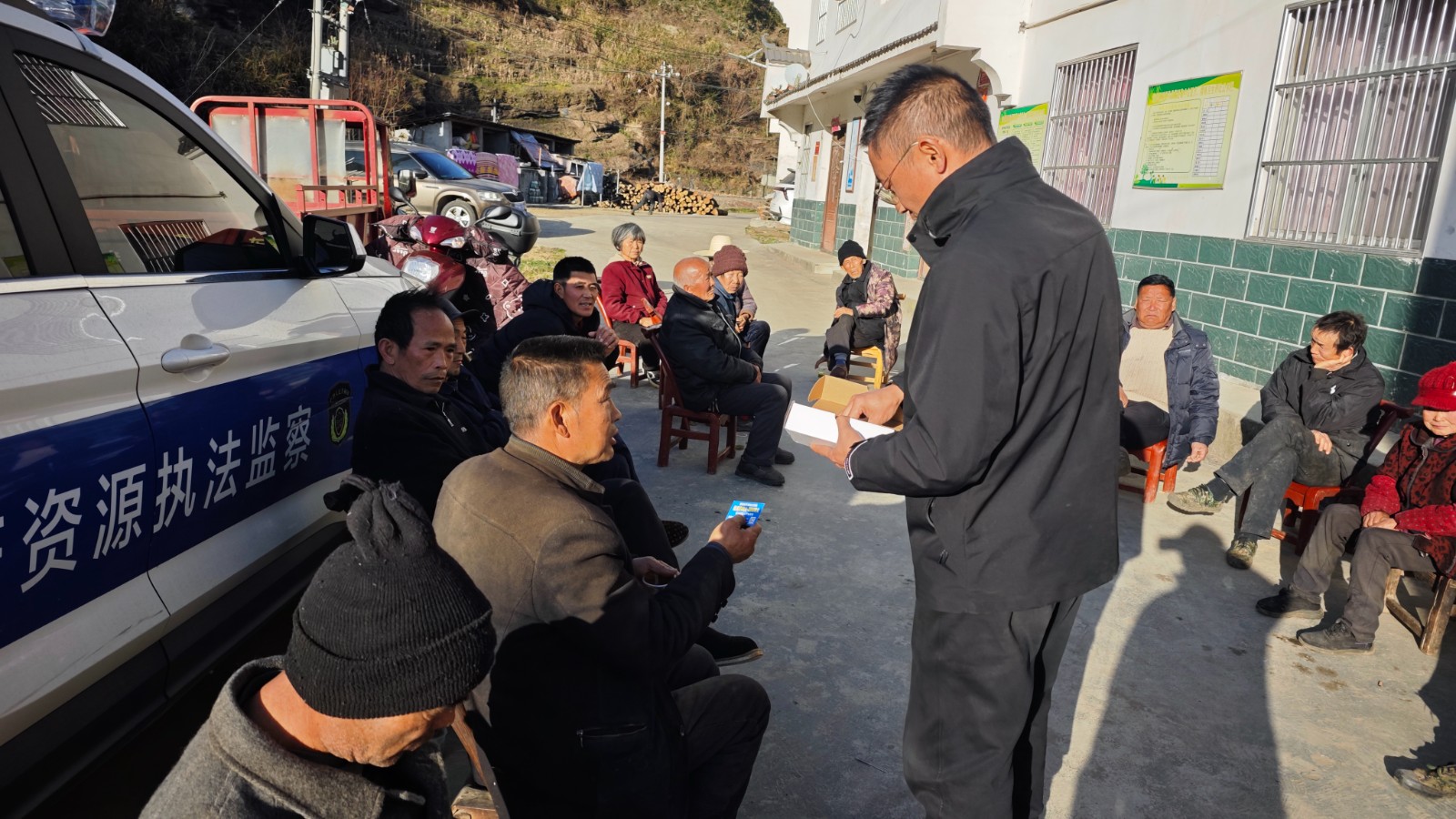 今日竹山网消息 为进一步夯实矿山安全群众防线,切实营造“齐抓共管、全民同治”有利局面,宝丰镇矿管办联合镇司法所、村委会深入涉矿村借助院子会和入户走访契机开展矿山封禁及有奖举报政策宣讲。近日,新河村土地岭安置点召开院子会,专班应邀在会上开展宣讲并发放有奖举报卡片。