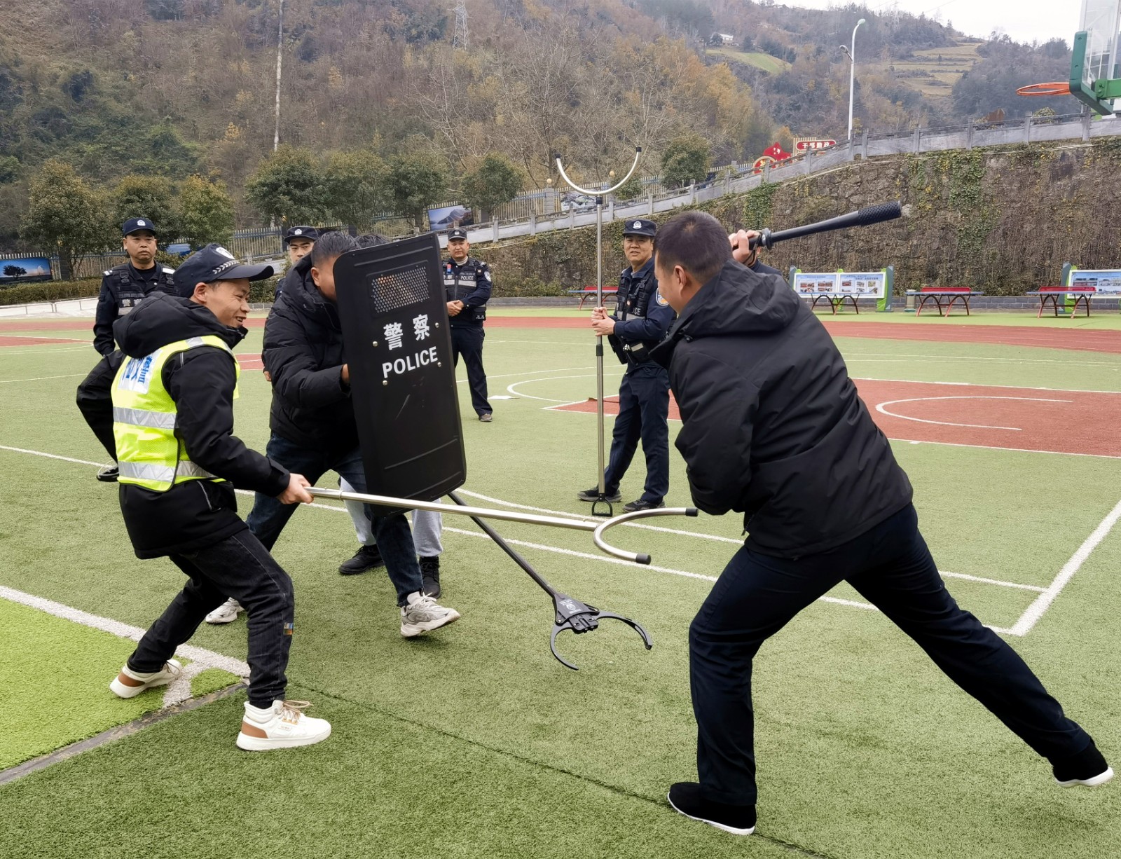 演练结束后,派出所民警结合实战需要,对护校队教师及安保人员进行了专项技能培训,详细讲解防暴盾牌、防暴钢叉等器械的使用方法与技巧,示范如何在保护师生和自身安全的前提下有效控制局面。参训人员通过模拟对抗进行了实操练习,进一步掌握了应急处置的关键步骤与协同要领。