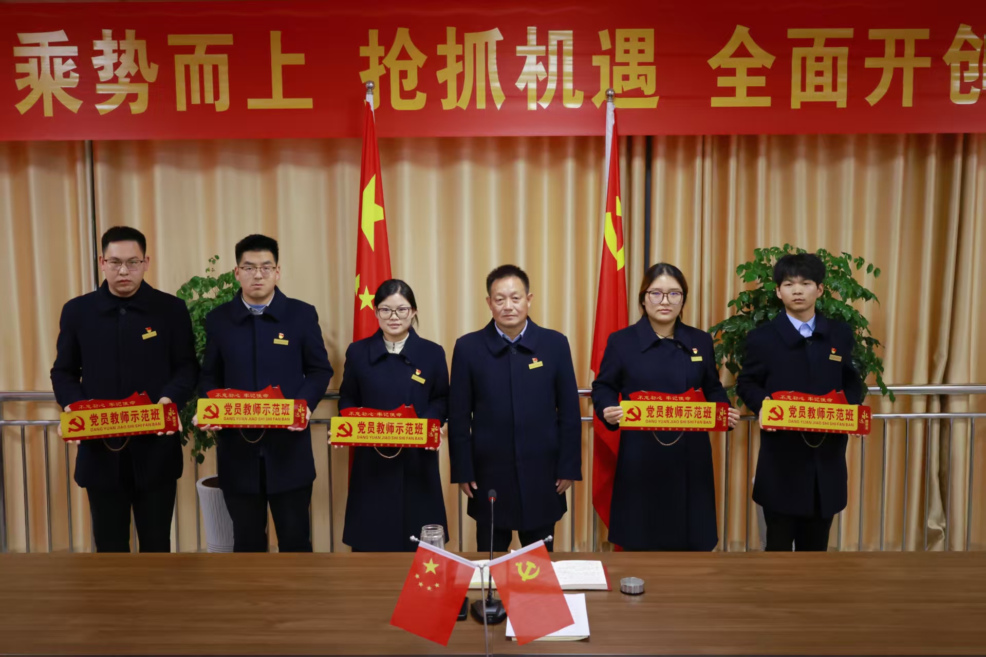 活动现场举行了“党员示范岗”“党员示范班”授牌仪式,全体受表彰的党员同志与示范班代表纷纷表示,将珍惜荣誉、不负重托,立足本职岗位创先争优,以实际行动引领全体师生凝聚奋进力量。 活动最后,郭书记总结强调,本次主题党日活动是学校学习贯彻党的二十届四中全会精神的重要举措,全体党员教师要以此次活动为契机,深刻把握全会精神实质,将学习成果转化为教书育人的强大动力;要以“党员示范岗”“党员示范班”为标杆,强化责任担当,发挥示范引领作用,在教育教学中勇挑重担、锐意进取;要紧扣“十五五”规划要求,聚焦教育高质量发展,深耕立德树人根本任务,为培养具有家国情怀与时代素养的优秀人才、办好人民满意的教育贡献党员力量。