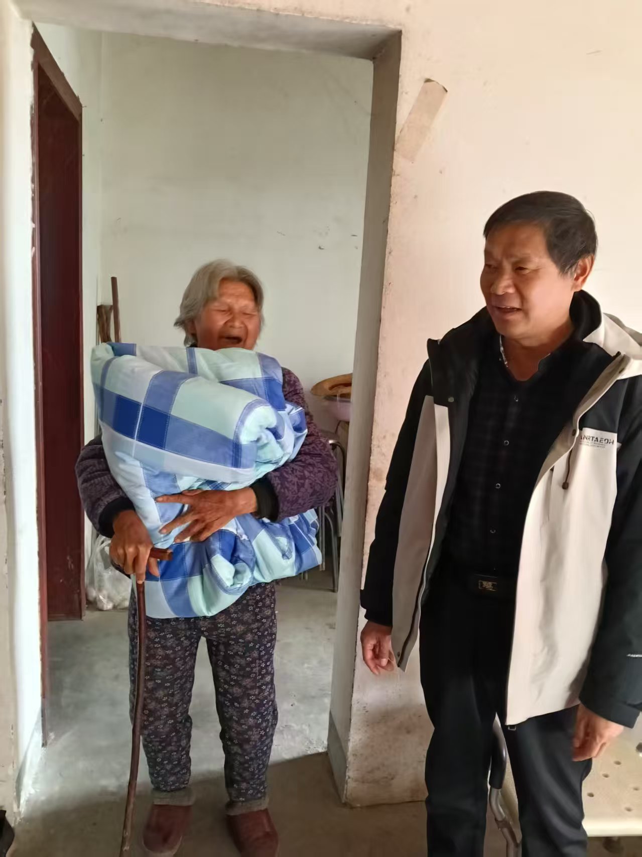 走访过程中,慰问干部们化身“暖心使者”,将崭新的棉被递到村民手中,反复叮嘱他们注意冬季用火用电安全,做好居家保暖措施。