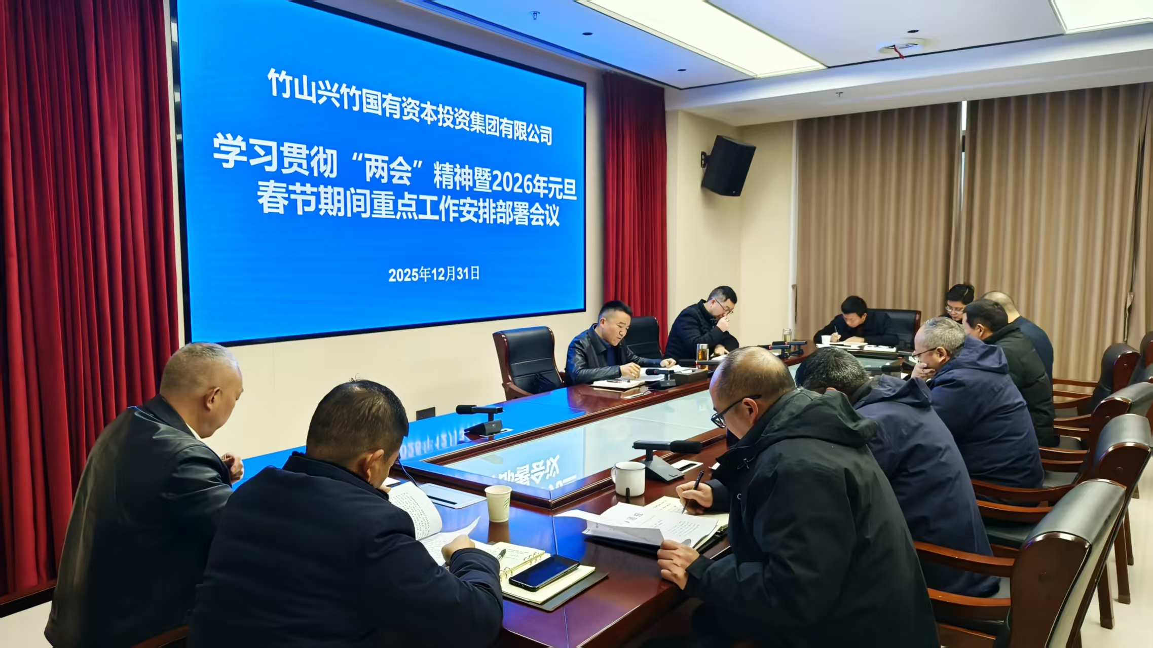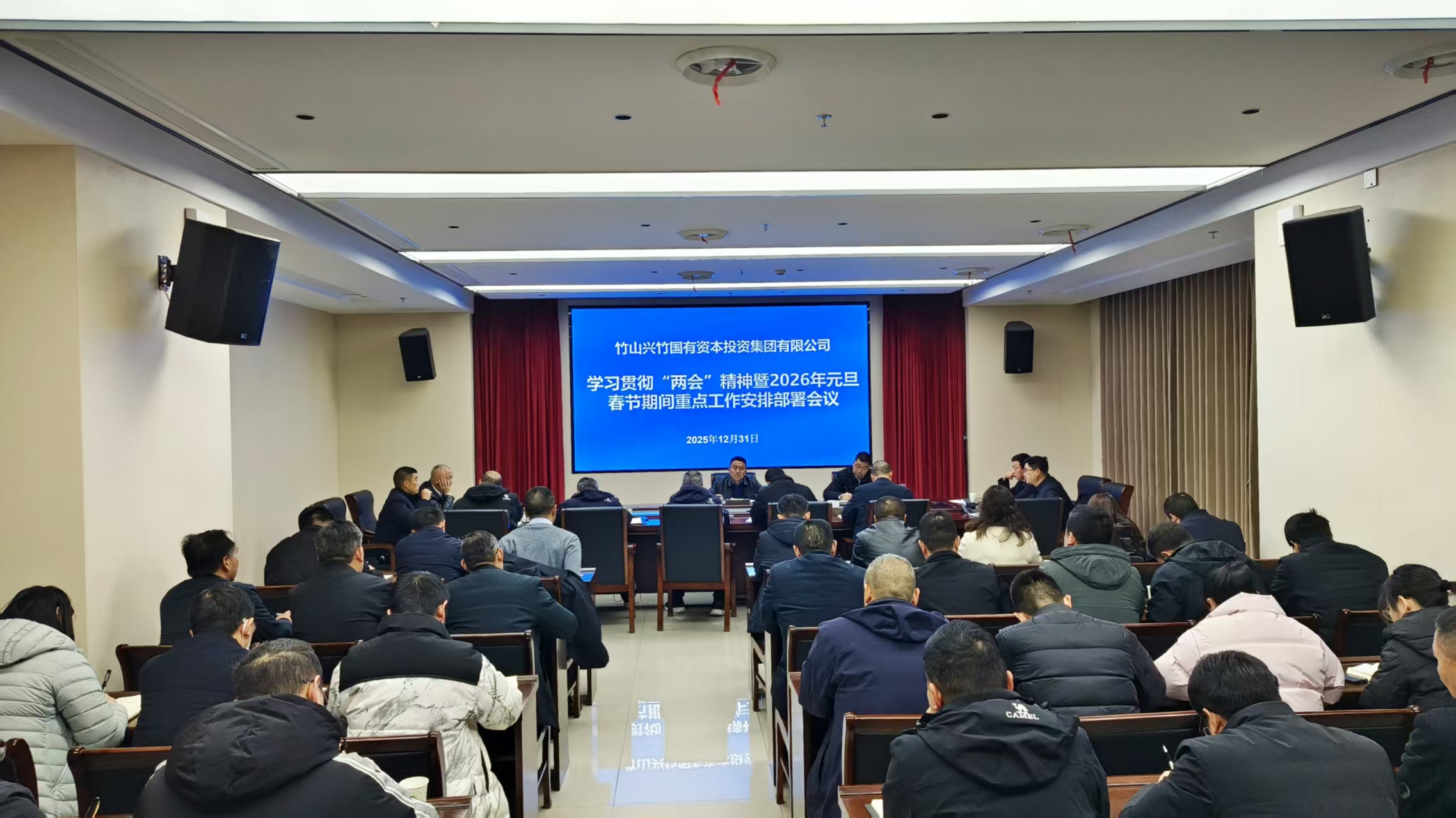 今日竹山网消息 12月31日,兴竹国投集团召开学习贯彻两会精神暨2026年元旦春节期间重点工作安排会议。集团全体党委领导班子成员,资投集团、城乡集团、基建集团、绿松石公司全体领导班子成员及集团系统中层以上干部职工参加会议。