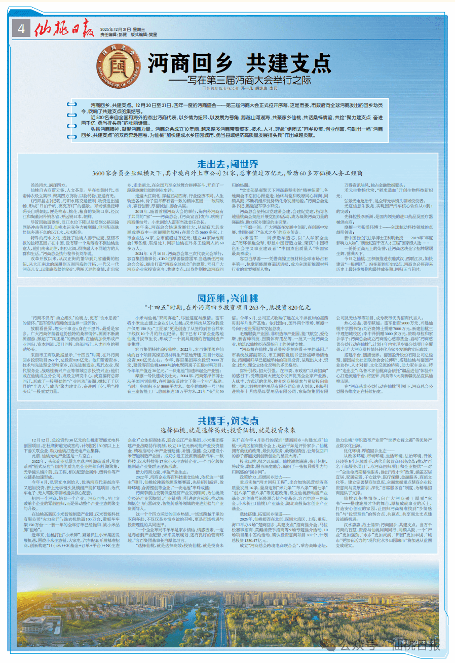 汉水淼淼,故土情深;沔商回乡,共建支点。当万千沔商的智慧、资源与仙桃同向同行、同频共振,一个“产业”更加强劲、“水乡”更加灵润、“田园”更加丰饶、“城市”更加有活力的“现代化水乡田园城市”将加速从蓝图变成现实。