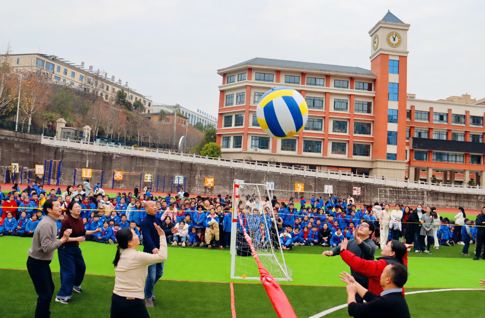 团体项目将气氛推向高潮。“钻呼啦圈”比赛考验团队默契,排球赛精彩纷呈。场边师生加油声、欢笑声不断。(吴琼 周慧)