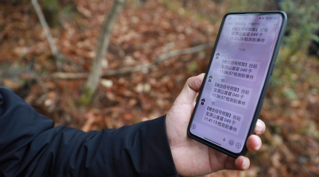 为验证其效能,记者跟随秦古镇矿管办主任陶卫峰前往地形复杂、历史废弃矿洞众多的宝源矿业向家河矿区实地检验。现场,监测设备隐匿于林间,默默值守。陶卫峰用石块敲击地面模拟盗采活动,短短时间内,他的手机便收到了详细的预警短信,清晰载明了震动发生的位置、特征和具体时间。几乎同时,附近巡查的护矿队员也收到信息,迅速赶到现场核查。
