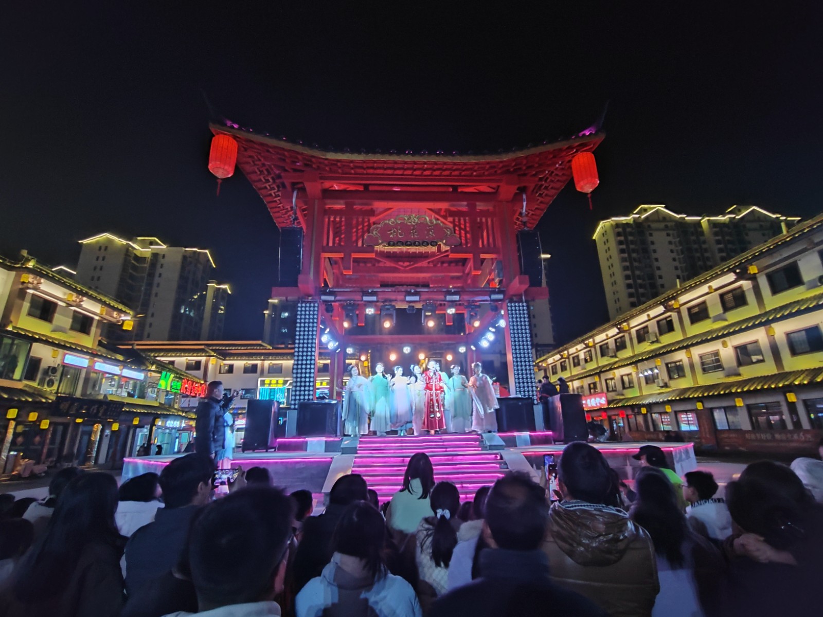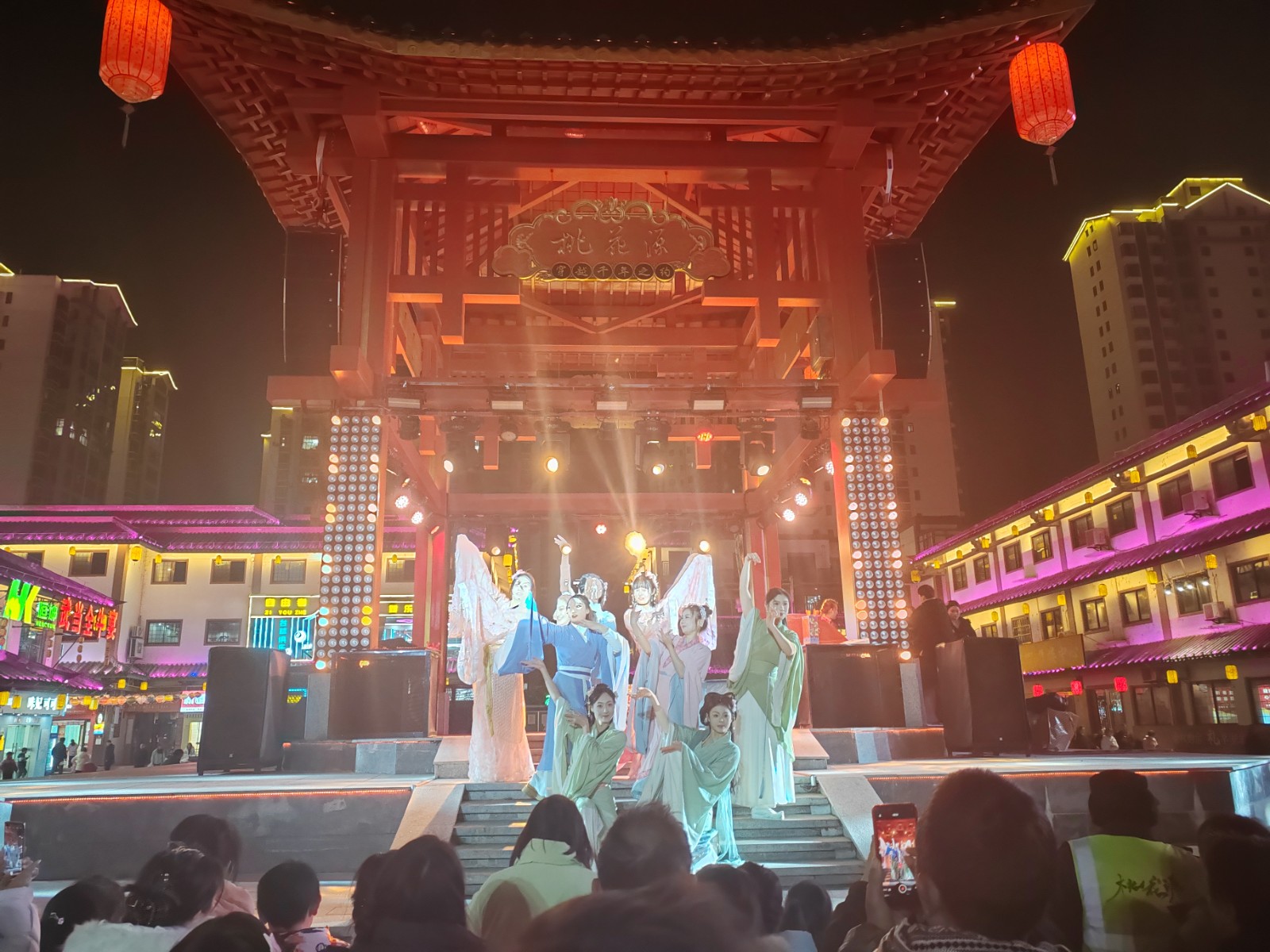 活动以古庸历史为线,开篇再现庸王施治、礼乐兴盛的盛景,《庸风》古舞尽显故国风华;剧情推进中,“庸王招贤” 投壶互动点燃现场,游客竞技赢 “参军资格”“银票”,让历史场景鲜活可感。烽火散尽后,《桃花源里好耕田》等舞蹈勾勒耕读祥和,桃花姑娘以山歌《月牙闹五更》牵线,游客参与 “山歌觅良缘” 互动考验,最终 “新人” 喜结连理,《合碗席》舞蹈与敬酒送福将氛围推向高潮,尾声篝火舞让众人手拉手共庆新年。