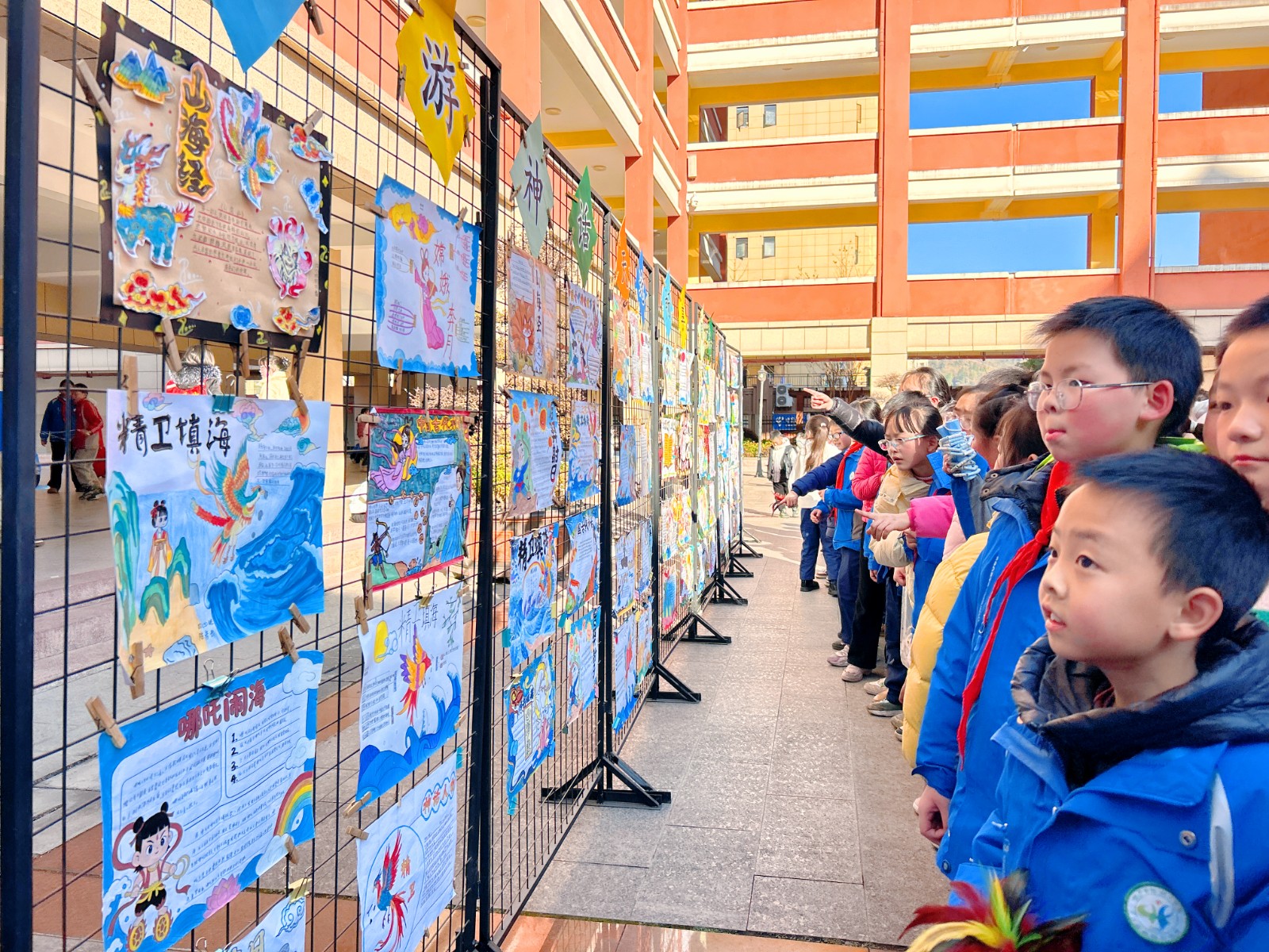 本次展览展示学生60余幅精心创作的手抄报,从盘古开天到嫦娥奔月,学生以画笔和文字呈现阅读感悟与想象,作品布局精巧、图文并茂,体现对神话的深刻理解与独特诠释。