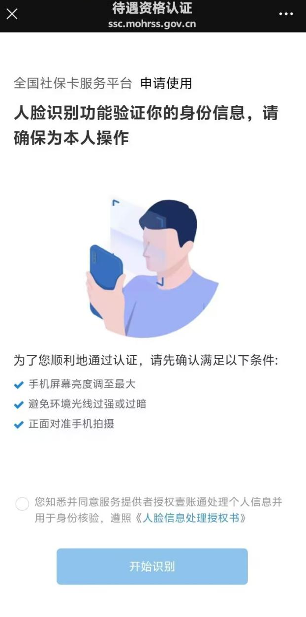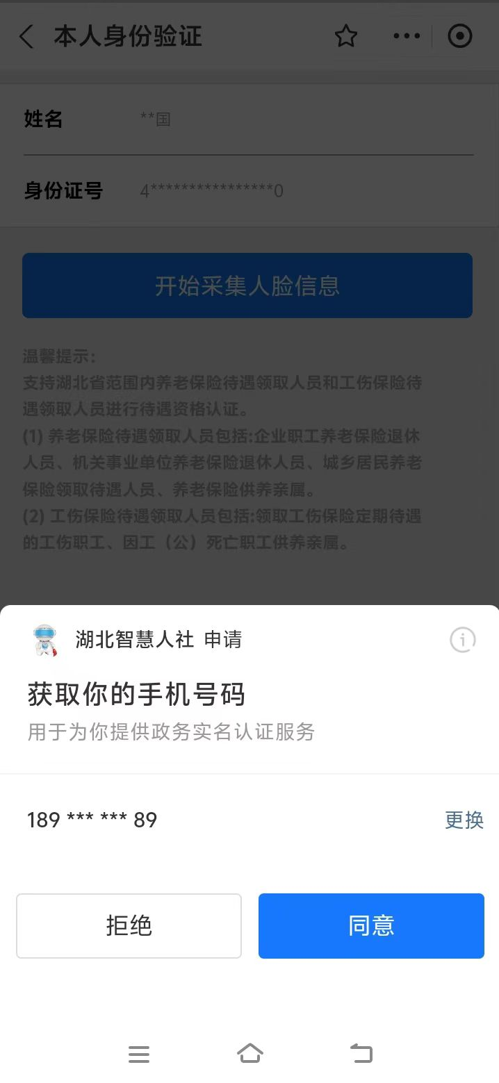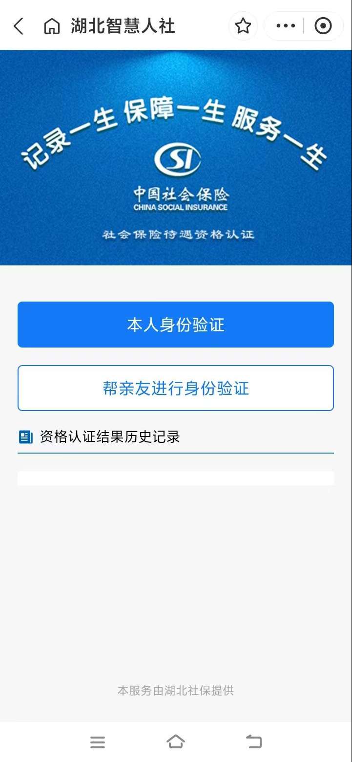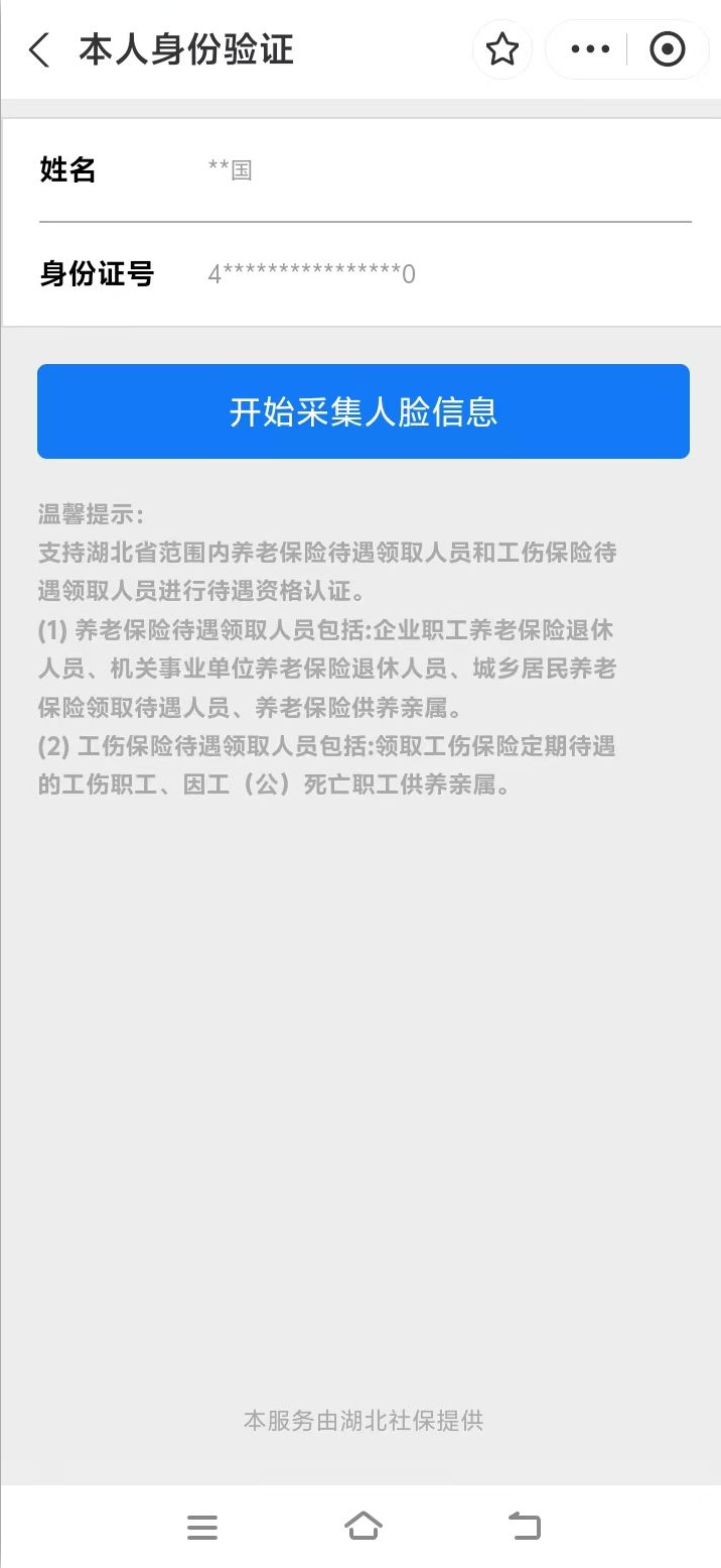 1.扫描上方二维码后,跳转进入湖北省智慧人社界面,点击“本人身份验证”或者“帮亲友进行身份验证”,填入“姓名”“身份证号”,点击“开始采集人脸信息”即可开始资格认证。