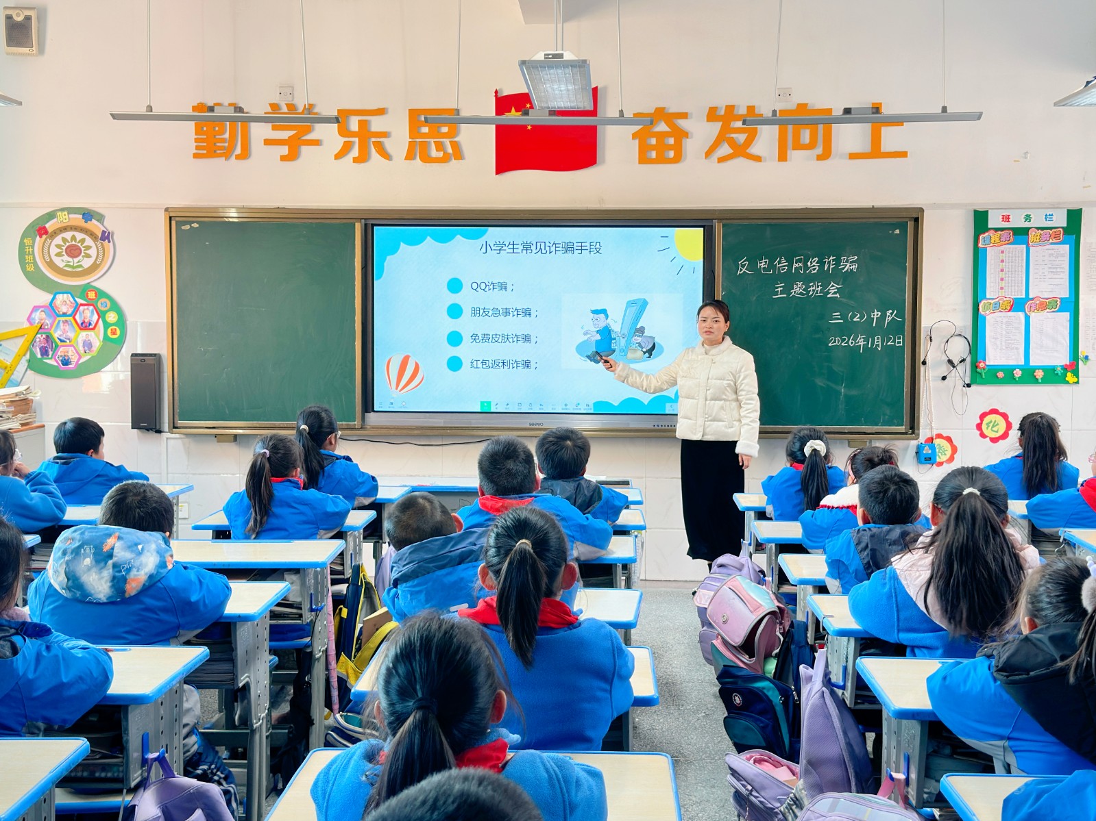 针对岁末年初诈骗高发特点,学校将防电诈教育融入国旗下讲话、主题班会等日常教学,剖析“游戏皮肤中奖”等常见案例,传授防诈口诀,增强学生识别和自我保护能力。同时,学校启动“小手拉大手”活动,鼓励学生向家长传递防诈知识,实现“教育一个学生、带动一个家庭、辐射整个社会”的联动效应。