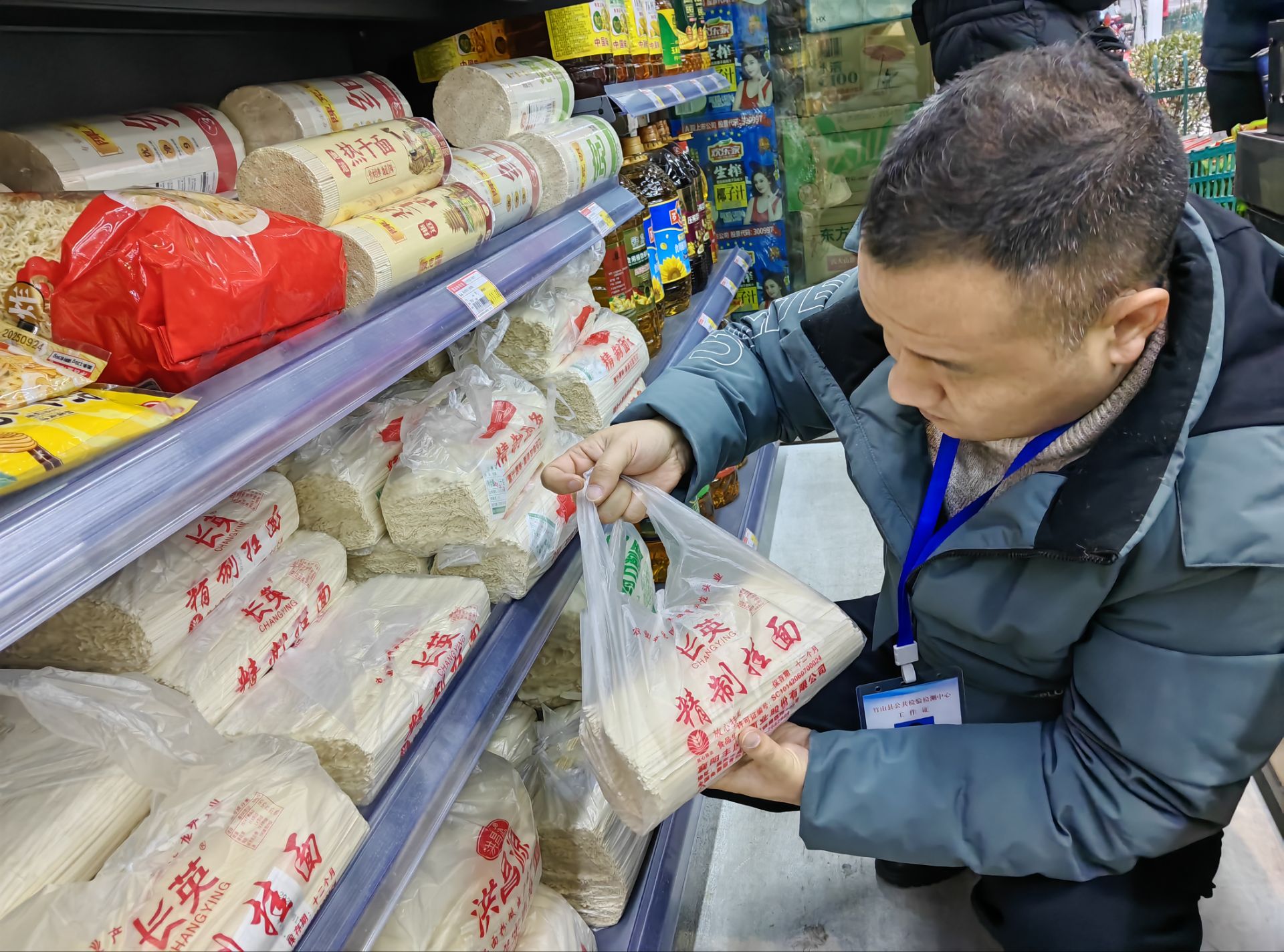 (抽检人员现场随机抽取挂面、红柚样品)