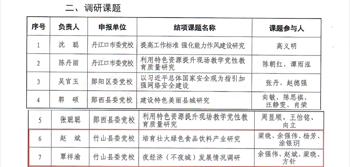 今日竹山网消息 近日,十堰市党校系统市情合作及调研课题结项名单公布,由县委党校教师主持的三项课题成功通过评审。分别是梁晓老师主持的《十堰市林下经济振兴研究》,赵斌老师主持的《培育壮大绿色食品饮料产业研究》,覃祥渝老师主持的《夜经济(不夜城)发展情况调研》。