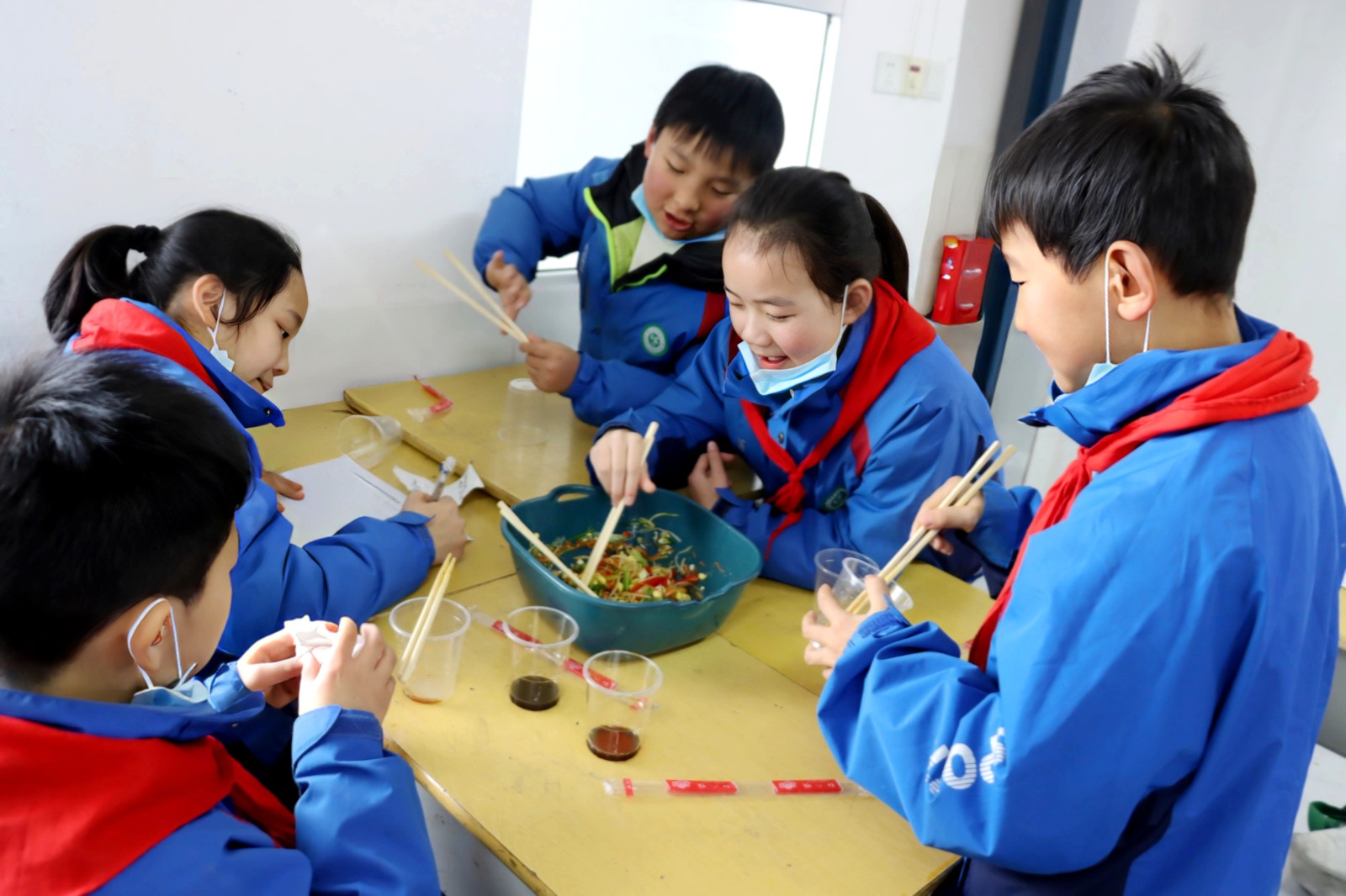 活动中,小选手们化身“美食小厨神”,动作娴熟利落。择洗、分拣、沥干水分,准备工作有条不紊;精准拿捏盐、醋、生抽、香油配比,熟练调配风味酱汁;巧用葱花、香菜点缀增色,妙借蒜末、小米辣提味增香。清脆的豆芽在一双双小手下完成蜕变,变成一盘盘色泽诱人、爽口鲜香的凉拌佳肴。同学们围坐一起,相互观摩、品尝点评、分享妙招,教室里处处洋溢着劳动的快乐与食材的清香。