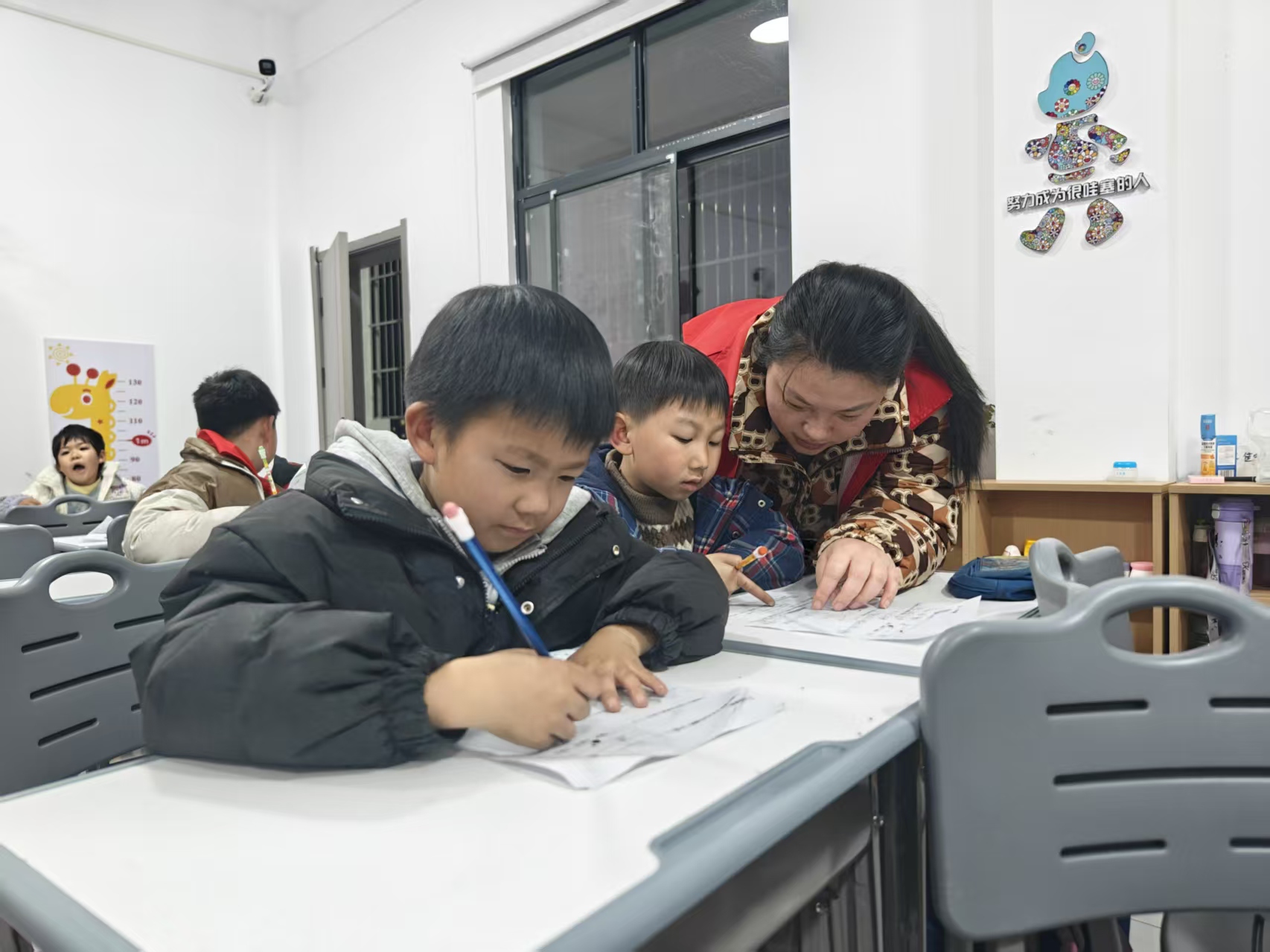 当晚,4 名青年干部来到洪坪托育中心,陪孩子们度过温暖夜晚。活动中,他们耐心检查、辅导作业,解答难题,以趣味互动巩固知识;完成课业后,与孩子做游戏、交流趣事,气氛温馨。这是托育中心晚间课业日常,也是青年干部“每周一赴约”的缩影。